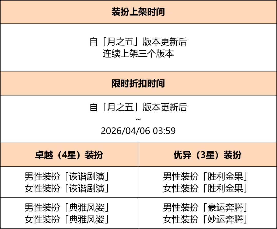 ● 「月之五」版本上新套装,当期的卓越(4星)装扮套装折扣期间售价为960事象凝核,限时折扣结束后价格将恢复至1200事象凝核;当期的优异(3星)装扮「胜利金果」套装折扣期间售价为160事象凝核,限时折扣结束后价格将恢复至200事象凝核,「豪运奔腾」及「妙运奔腾」套装折扣期间售价为240事象凝核,限时折扣结束后价格将恢复至300事象凝核。