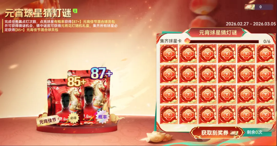 完成任务赢点灯次数,点亮球星有概率获得【87+】元宵佳节混合球员包并可获得猜谜机会,猜中谜底可获得元宵花灯随机礼盒,集齐所有球星必定获得【85+】元宵佳节混合球员包。元宵佳节,好运降临。现在参与活动,说不定下一张刮出的就是你想要的巨星!
