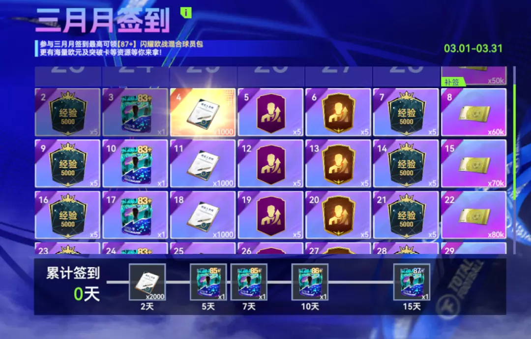 每日签到每日领,活动期间累计签到最高可得【87+】主题球员包。三月春风起,正是登录时!每天上线,留下你的印记,等到月底【87+】球员包就能稳稳到手!