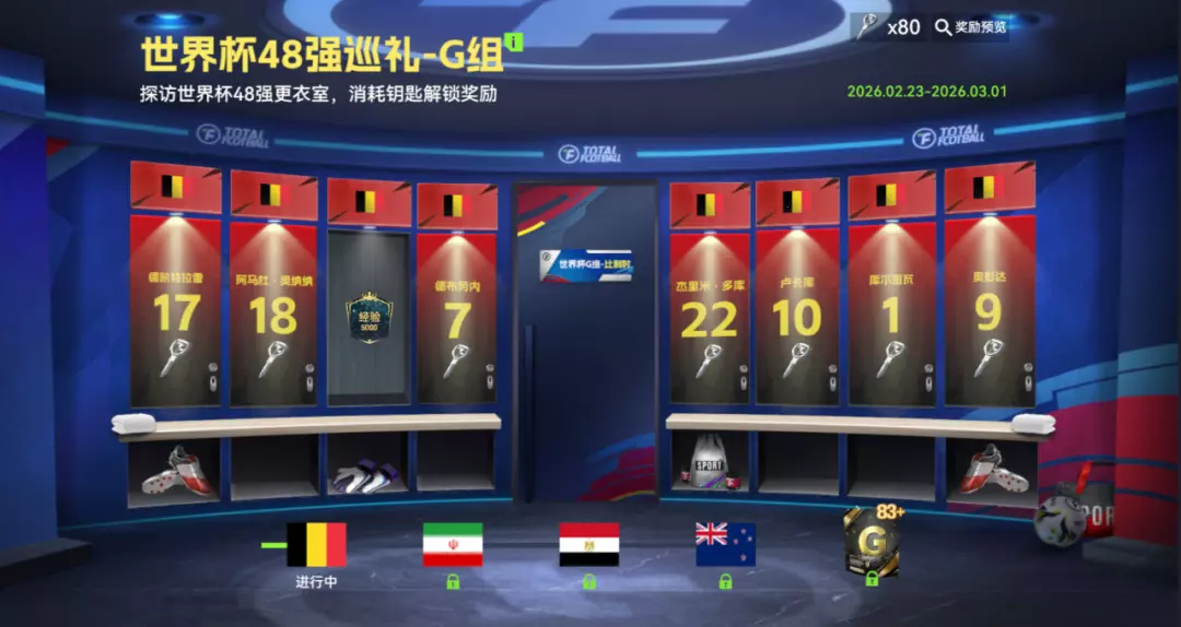 探访世界杯48强更衣室,消耗钥匙解锁奖励。世界杯之旅继续深入,本周我们来到G组更衣室。推开大门,感受不同足球文化的碰撞,欧洲红魔、法老军团、波斯铁骑、全白队......探索不停,收获不断!