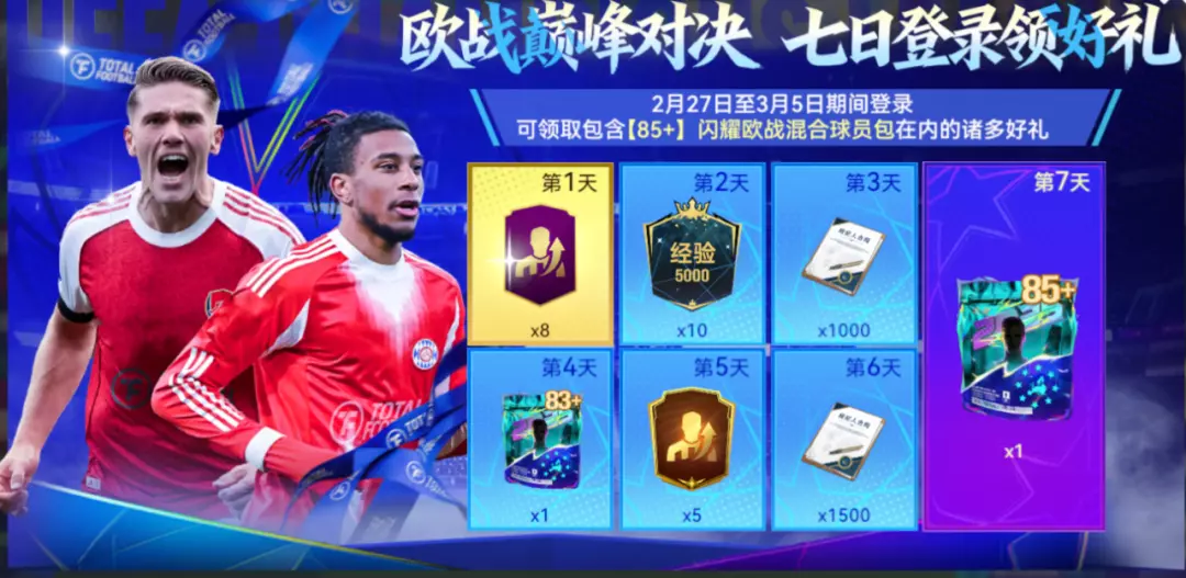 2月27日至3月05日期间累计登录可领取包含【85+】闪耀欧战混合球员包在内的诸多好礼。连续七天登录,把欧战明星带回你的球队!下一场对决,你也能派出“欧冠级别”的阵容!