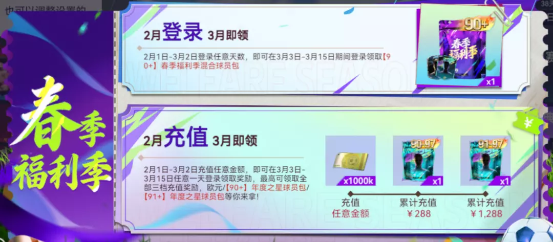 2月1日-3月2日期间登录任意天数,即可在3月3日-3月15日期间登录领取【90+】年度/经典混合球员包。初春留下脚印,三月来领巨星,【90+】球员包好礼就在这里等你!