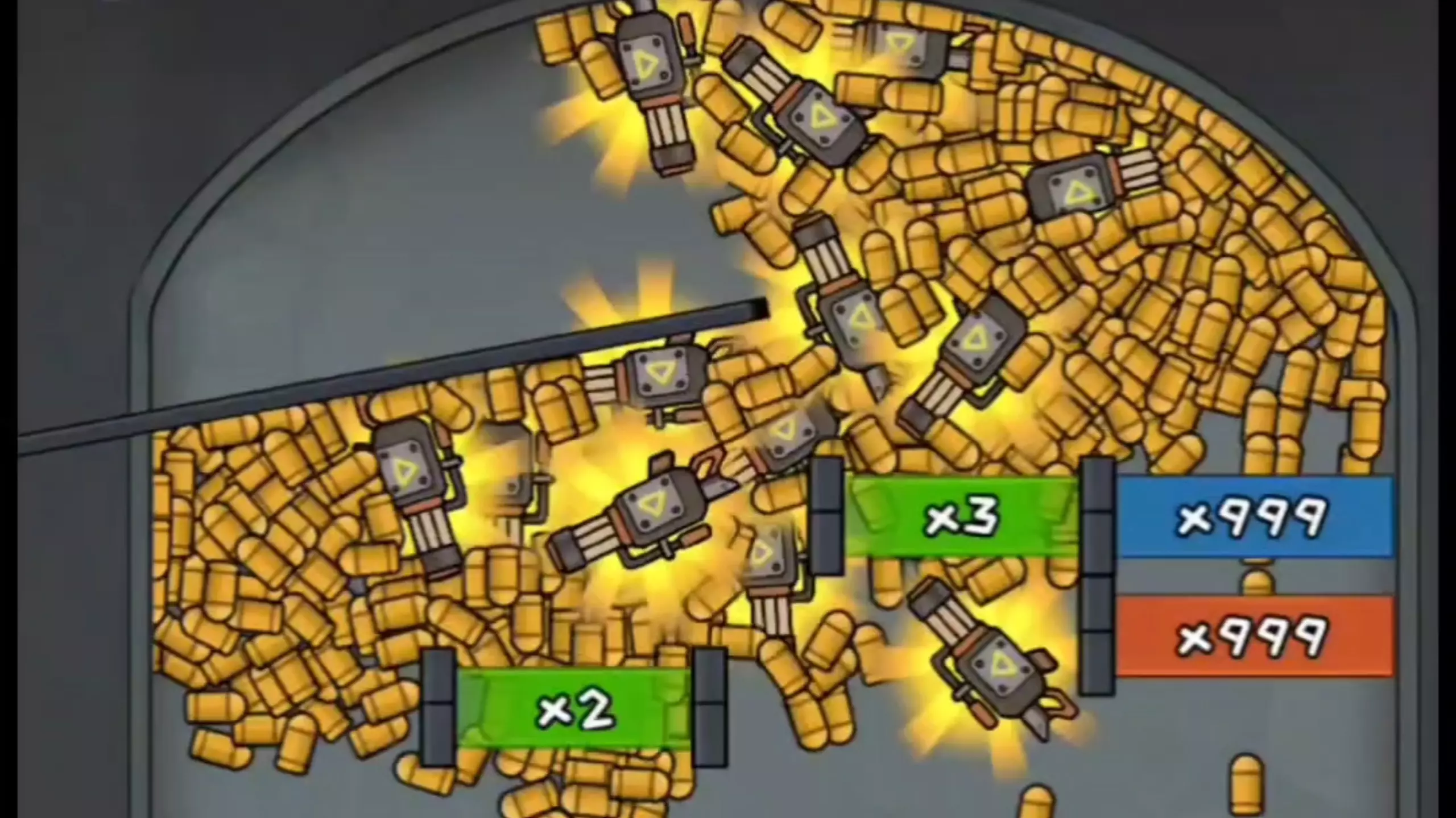 这是一则《让子弹射》的游戏实况,玩家在游戏中解锁了加特林武器对抗怪物,最终还是败给了怪物,该玩法需通关主线第2章后从主界面进入。