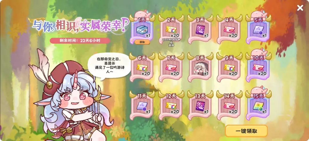 活动说明:活动期间,可依据累计上限天数获得奖励。首日即可获得玛约居住的房间【收集狂家具套装宝箱】,参与活动还能获得【性格招募券】、【使徒招募券】、【艾!达!特级招募券】等超多奖励等圣团长来拿。
