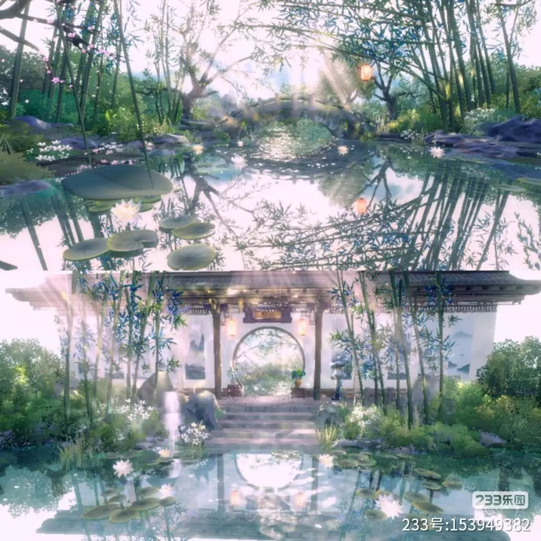 好多竹子围着一个小亭子,白墙黑瓦的房子清清楚楚地映在清清的池水里,白色的睡莲和小花也开得正好,阳光穿过竹叶,在地上洒下好多亮闪闪的小光斑,连空气都变得清清爽爽,就像走进了江南的小院子里一样。
