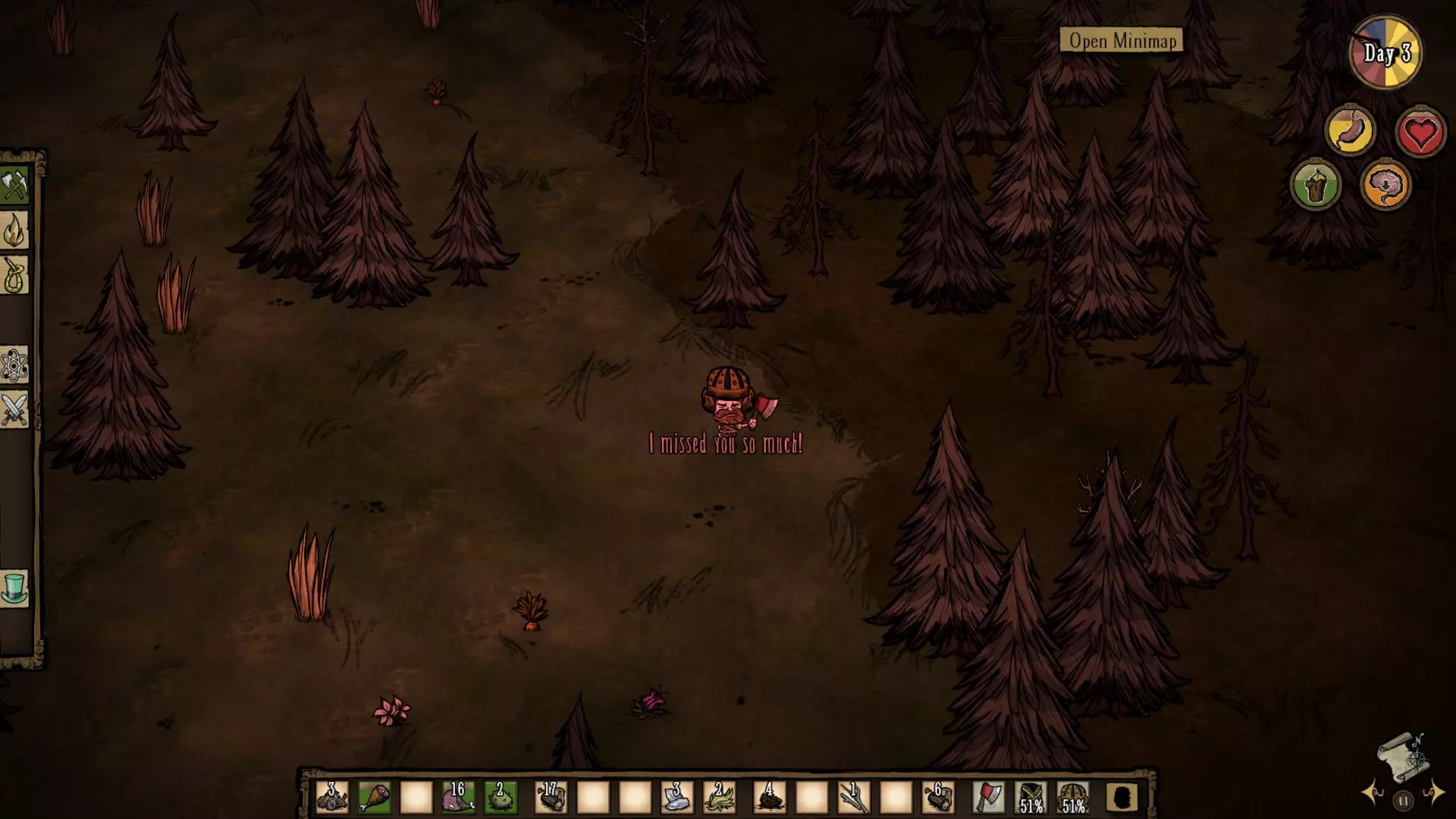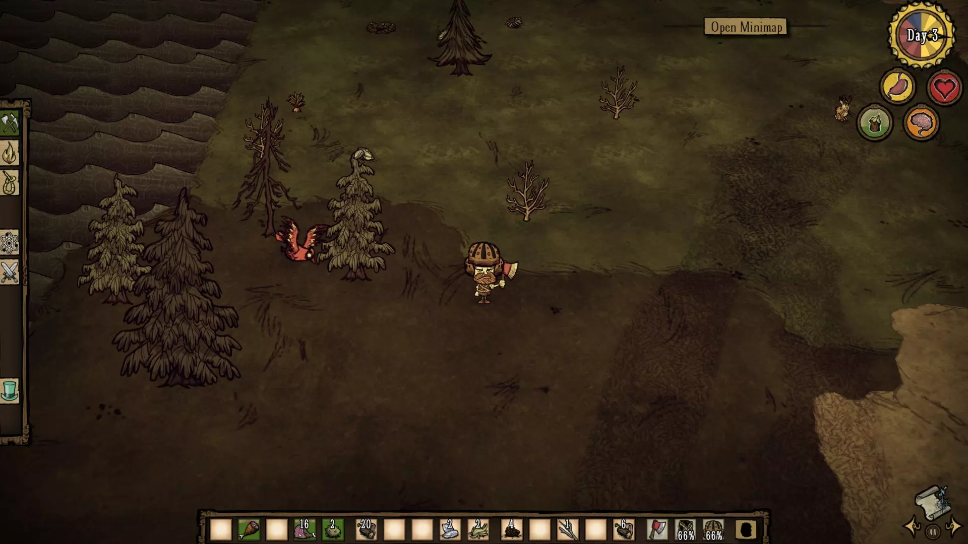 If you're playing on public server, always unequip your clothes before transforming (except backpacks) as other players can steal them.Few things are worse than lose (for example) Beefalo hat, because random player picks it and then sets on journey, which results into his death in unknown location. If some players picks up all Logs and Pine cones meanwhile you're beaver, tell them to atleast return Pine cones/Birchnuts, these are your priority. If you die as beaver and somebody ressurects you, you'll still be beaver, so be prepared to finish what you started, before you'll be insane again. Sanity management - Pinecone rule Another sort of things you will encounter in dst is enourmous number of players who use Pine cones only as fuel or leave them on ground. This results in tree/forrest decimation and these players must later move far away from base to find some trees, altrough it wouldn't hurt them to simply plant these, cones instead of using them as small fuel for fire. Klei made great solution for Pine cones, as they are now important part of Woodie gameplay. One will become insane easily being in beaver form, but planting pine cone gives you +5 sanity. Woodie has 200 sanity and you need to plant 40 pinecones to get from absolute insanity to complete sanity. After you spawn in the world, choping large Evergreens/Birch trees should be first thing you do alongside with collecting grass/twigs/flints and mining boulders. Because Pine cones are answer for maintaining Woodie's sanity, you should get atleast 20 of them as soon as possible, so that you can transform into beaver once you spot forrest without being afraid of sanity wreck. Tree farms - how to make them correctly Once you set your place for base, you must dedicate some space for tree farms. This area: A) Shouldn't contain anything else flamable, because there are stumps left after the trees. There is no point to dig/gnaw them, because it takes 3 gnaws and that is just not worth it. Once there is field of stumps, just simply torch it. Burning stumps will emit heat and light for couple of seconds and you can farm ashes that way. Ashes can be used in healing salves (survival craft) to heal 20 health points, which is extremely profitable way to upgrade spider glands. B) Shouldn't be close to hostile creature sources. Never plant trees in dangerous areas such as opened cave entrances, spider dens, ponds and other sources spawning enemies. Beaver has only 20% protection and his gnaw is weak - these enemies will slow down your work, forcing you to stay in beaver mode longer and making you insane even more. You should consider planting pine cones in groups just in case of fire, so that you lose only one group instead of all the trees you have planted. Once you have atleast 4-6 groups, you can keep them as sanity heal provision. If you have build ice flingomatic, you can forget about grouping. Just don't forget to refuel it. Tree farm should be made in day 5/6, so that pine cones has enough time to grow into Adult trees on day 11 (where first Fullmoon occurs) for maximizing Woodie's potential in terms of gathering wood. Fullmoon: Woodie's biggest (dis)advantage? When Fullmoon comes, Log meter will automatically reach 25 points and Woodie will turn into Beaver. Log meter decreases by 1,4 points per second And if you don't start to gnaw trees/ eat something immediately, you will starve because of empty log meter. However, fullmoon is the only time where you're able to spend whole night gnawing trees down in beaver form 9x faster than other characters. Combined with decent tree farm, this results into extreme amount of logs/pinecones/birchnuts in single night. Beaver can gnaw one Adult tree in slightly more than one second, so look at the time of fullmoon night and calculate yourself how many Logs/Cones can be obtained in single night. I suggest you to subscribe client mod (works on any server) called "Combined Status". You can choose in settings to show actual moon phase, so you will know when fullmoon comes. Extremely usefull mod with Woodie, which may save lives. It takes 5/6 days from Pine cone to Adult tree. DayTime(sec)Sanity Loss 11 90 145+ 31180200 Plant atleast 50/60 trees for first fullmoon and 100+ trees for second fullmoon. You should always prepare more trees than you can gnaw just to reach your maximum limit. Next fullmoon is always 20 days later. Sanity loss is meant only when you spend whole night in beaver form. It's accurate in short nights, but unpredictable in long nights. If you also think it's way too huge loss, then remind yourself you'll get enough pinecones to refill all the sanity back atleast twice. Sometimes you can have unlucky timing: such as fullmoon and upcoming hound wave. This is the reason to use trap weapons, whose will distract/kill attackers, leaving unarmed beaver alone and let him do his job. - Using Bee mine and forcing treeguard to step on it results in his distraction by bees. Even the smallest Treeguard can one-hit-kill bee, but bees unfortunately has kiting AI, very similar to pigs, so they should be able to dodge it. - Tooth traps are ideal as well against hounds. 3 toothtraps can kill normal hound and 2 toothtraps kills fire/ice hound. However, Fire hound death might result into forest burn most likely, so you will have to find enough gears to make Ice flingomatics you can turn on before fullmoon comes. - Willow's Bernie bear distracts nightmarish creatures in area around him. Woodie pairs well with Willow. (Sure, toothtraps are expensive due to tooths, but hounds shouldn't occur on first fullmoon, and Fire hounds, whose are biggest threat to Woodie starts to spawn in first Summer and second Autumn). I didn't make Tree farm and im too far away from forest, what should i do? A) Gnaw some trees you find around and eat logs to immediately transfrom back. Then spend Fullmoon eating materials. B) Disconnect, wait until night ends and reconnect back (better solution, no sanity loss and no material los