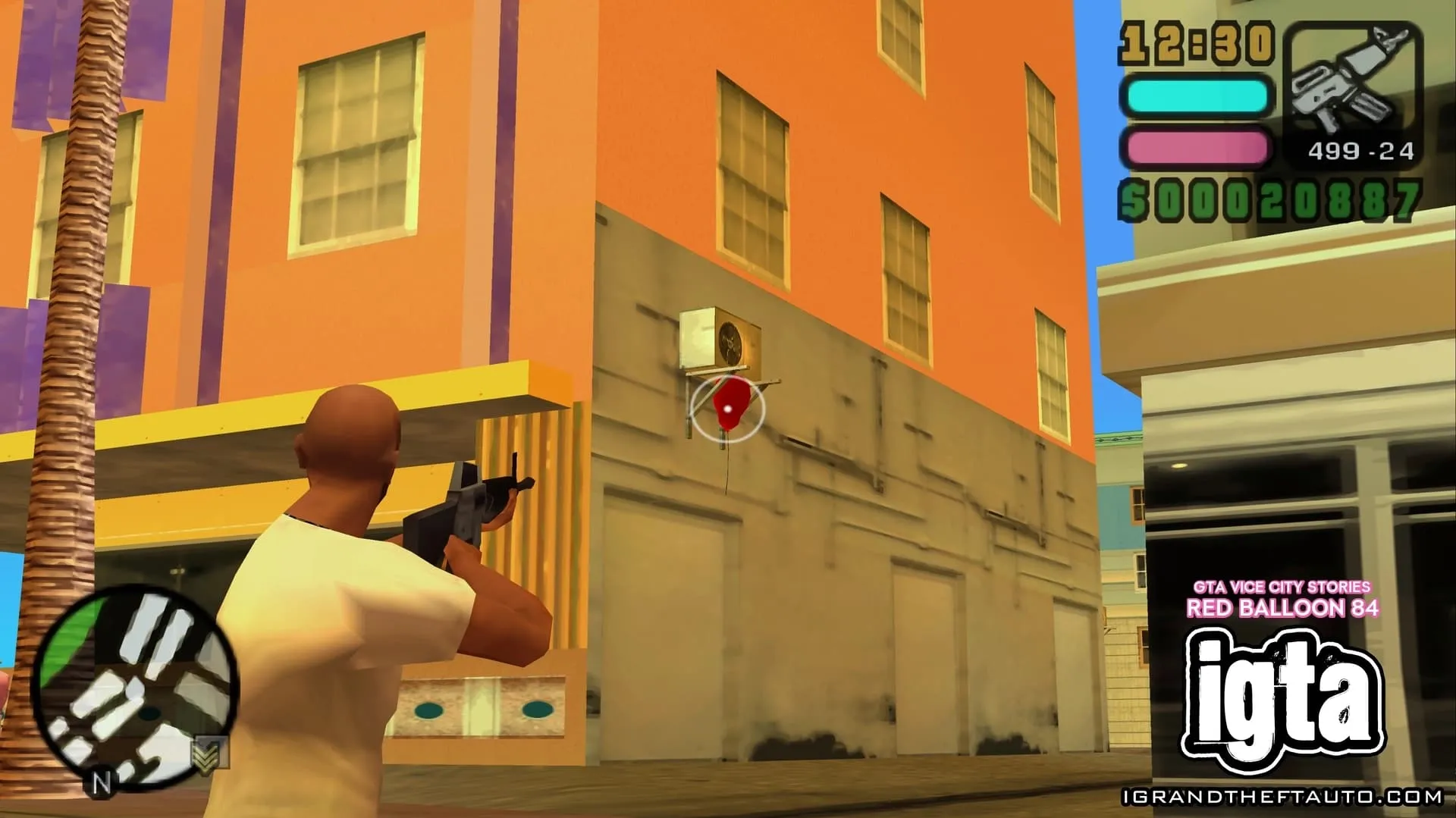 从上一个气球后面的黄色、粉色和紫色酒店走过去,你会发现下一个气球粘在拐角处墙上的空调机组上。