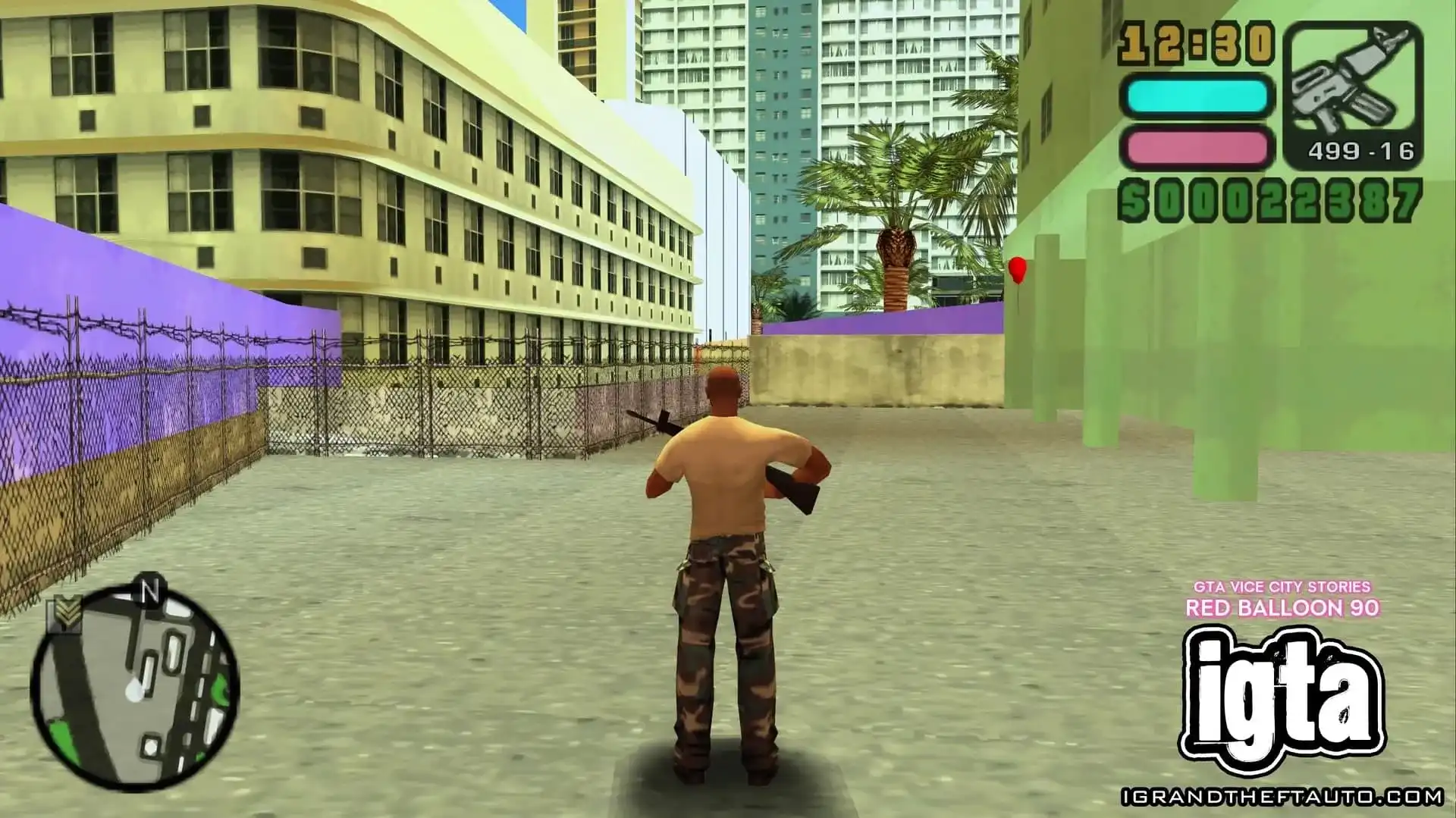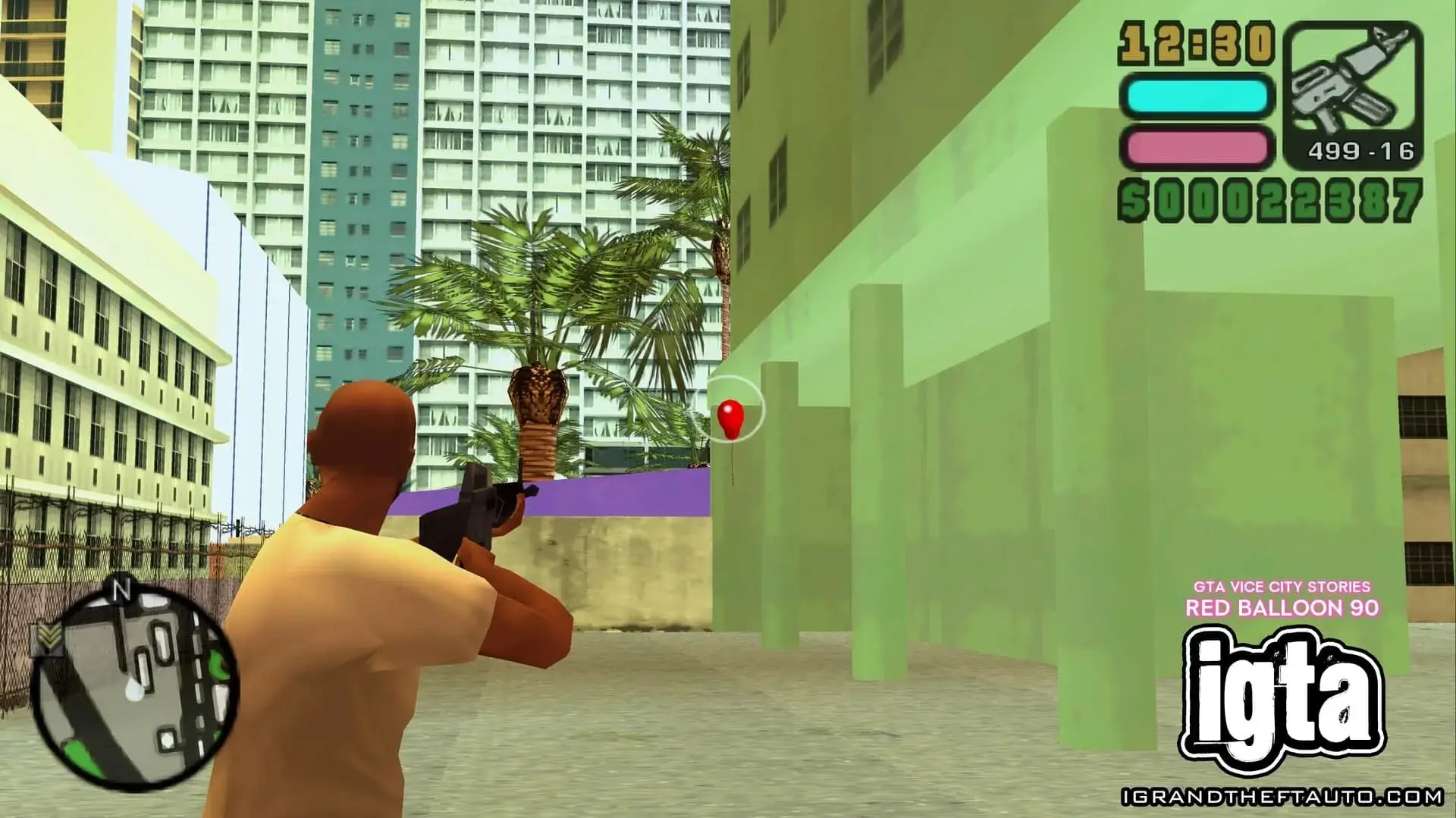 走到建筑后面,你会看到几面紫色的墙,红色的气球就在绿色建筑的后面,清晰可见。