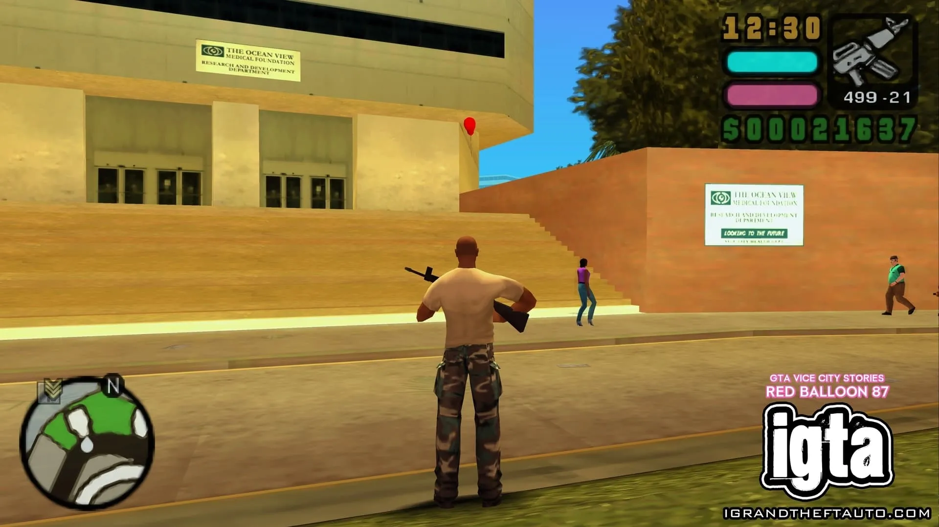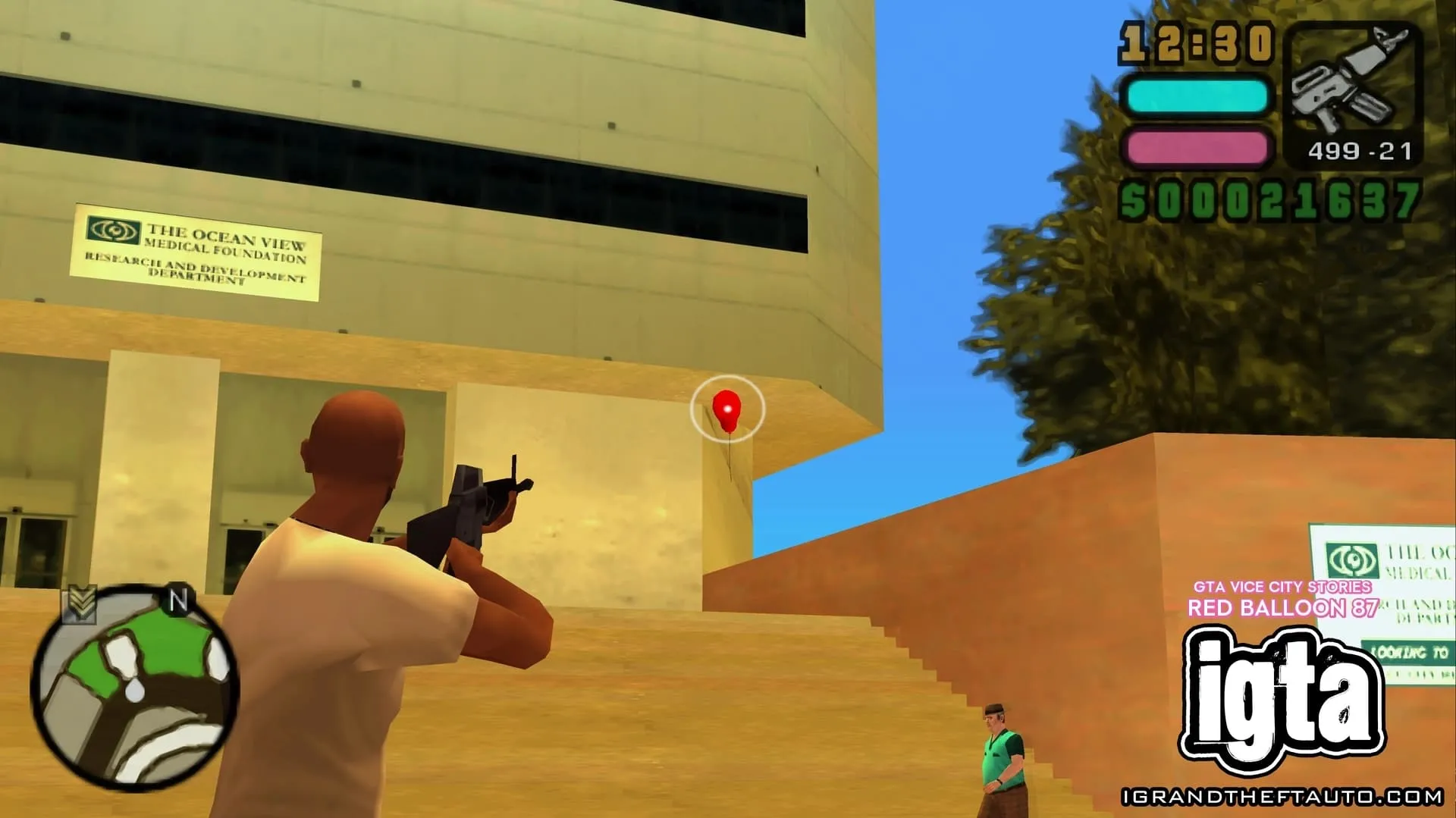 从之前那个气球的位置继续朝着码头方向走,你会来到海洋景观医疗基金会大楼旁边的一片花园,花园里有一些灌木和树木。
