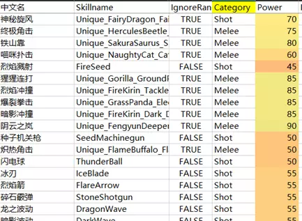而在技能文件中,每个技能都有个【种类】,分为【近战】或【射击】,正好对应帕鲁属性里的两种攻击力。种类为【近战】的技能大多是帕鲁自带的技能,无法通过果实获得,且在游戏中的表现确实是“近战”。