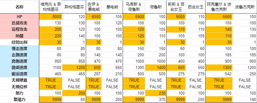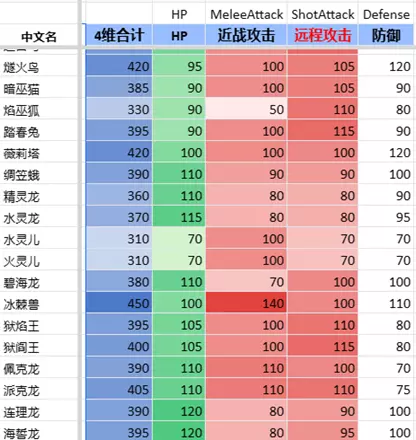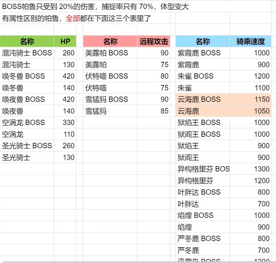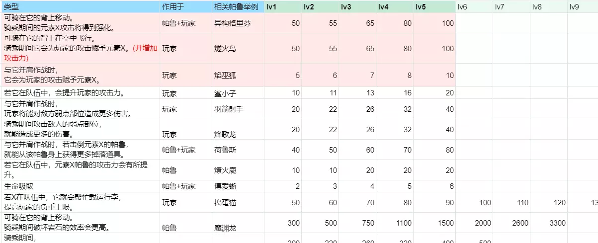 隐藏的骑乘增伤(最后几列是伙伴技能数值)大多数“骑乘后赋予玩家元素的技能”,虽然技能说明上没写,实际上玩家的攻击面板有个+50%~100%的BUFF。所有“骑乘后元素X攻击强化的技能”,是同时作用于帕鲁和玩家的,但一般玩家攻击没有元素,所以收不到元素加成。结合以上两点,唤冬兽的赋予元素冰+冰元素强化,会让玩家同时收到两种BUFF吗?很遗憾,不是。骑乘唤冬兽时玩家面板没有增加,增伤靠的是冰元素的50%~100%攻击力加成。