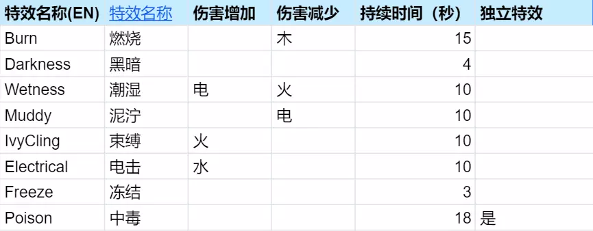 这些特效同时间只能存在一个。例如潮湿会覆盖燃烧,并不是水把火"浇灭"了,而是水技能打出的潮湿特效覆盖了燃烧特效。 中毒是个例外,帕鲁可以即燃烧又中毒 草系技能能打出的特效示例,具体请看:技能属性表