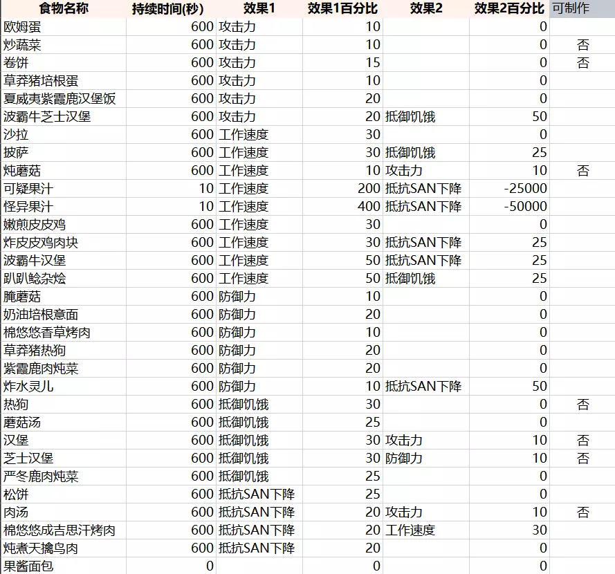 不同食物的详细增益效果自动化生产:攻击力食物种植番茄并搭配蛋制作欧姆蛋;工作食物种植生菜和番茄制作沙拉