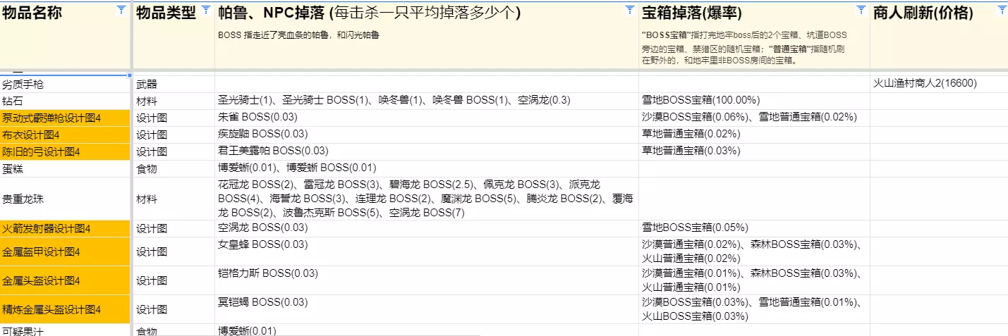 掉落物品查询除了能在基地制作的东西,一般物品有4种来源:帕鲁掉落,NPC掉落,宝箱掉落,商店刷新。 闪光和BOSS 闪光帕鲁和BOSS帕鲁的掉落是相同的,所以闪光朱雀也能和BOSS朱雀一样,出传奇喷子设计图。 宝箱类型的区别 宝箱分为普通宝箱和打完BOSS才能开的宝箱(代码里叫Normal和Special),这两种宝箱有着明显的区别。 BOSS宝箱指打完地牢boss后的2个宝箱、坑道BOSS旁边的宝箱、禁猎区的随机宝箱 普通宝箱指随机刷在野外的,和地牢里非BOSS房间的宝箱。 BOSS宝箱没有金币。比如在雪地打完BOSS,开的宝箱里必然有一颗钻石,绝对没有任何金币。雪地普通箱子就没有钻石。必然有金币 BOSS宝箱图纸等级更高。在普通宝箱掉落金属盔甲图纸时,BOSS宝箱已能掉落精炼金属盔甲图纸。 几个小结论 如果你想要传奇图纸,推荐去刷BOSS而非开宝箱。 钥匙的稳定来源:金钥匙刷黑商,铜钥匙刷朋克蜥。 单发步枪、双管霰弹枪、鸟枪、三联弓、火弓、毒弓没有图纸,只有普通品质。 高级装备的传奇图纸,平均击杀33只对应BOSS才掉落一个。 BOSS宝箱的图纸掉率是普通宝箱的3~5倍左右。 宝箱的掉落机制和帕鲁掉落不同,宝箱采用的是【掉落池】机制,开宝箱时,会随机从池子里按权重抽取一个物品掉落出来。表中“掉落率”是按照权重计算得出的,代表“我就想要某物品,开宝箱时物品正好是它的概率”。由于宝箱的权重机制,风灵月影修改器的100%掉率对宝箱无效,因为宝箱本身就是100%掉落物品,只是掉落的可能不是你想要的。