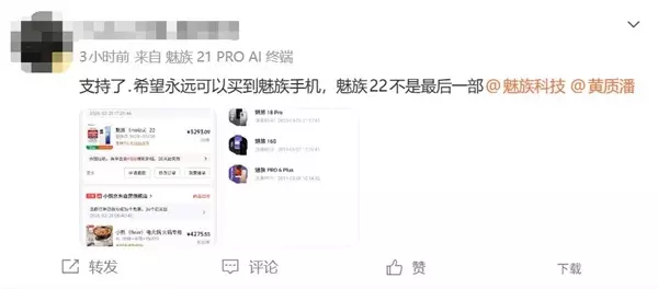 此前星纪魅族集团中国区CMO万志强曾公开表示,魅族23将在今年如期发布,并主打魅族史上最窄边框工艺。但最新进展显示,魅族23项目已停止推进,这款硬件产品大概率胎死腹中。 受此消息影响, 一位资深魅友果断下单了一台魅族22 16GB+512GB版本,花费3293.09元。 他表示,希望永远可以买到魅族手机,魅族22不是最后一部。