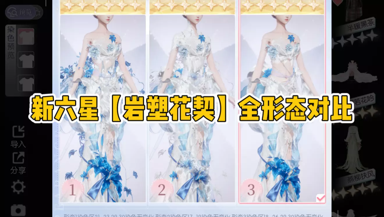 这是游戏《以闪亮之名》的六星时装「岩塑花契」多形态实机展示内容,展示了该时装的发型、裙子、手套等部件的不同形态对比,发帖者称赞该时装的集齐动作表现出色。
