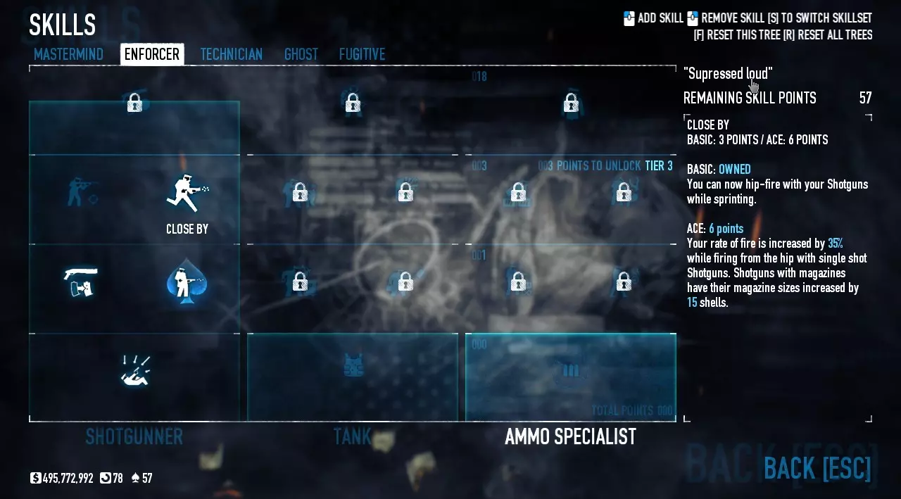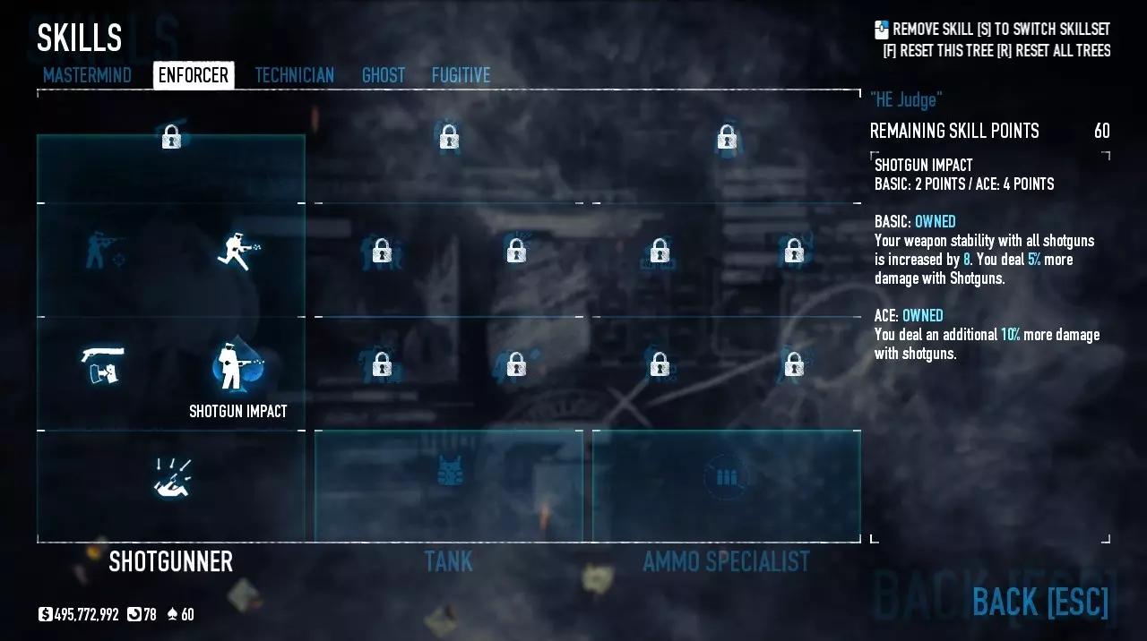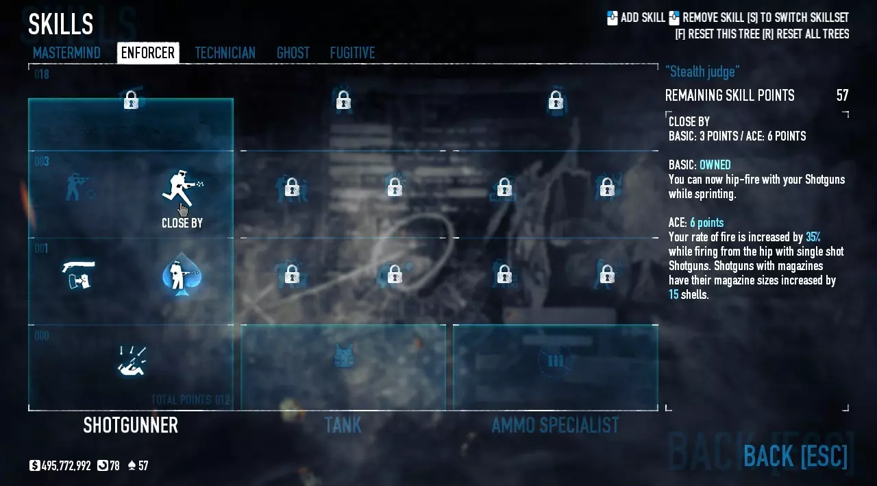 我正在使用: - 落魄者(基础) - 霰弹枪冲击力(专家) - 霰弹枪近距离作战(基础) - 近在咫尺(基础) 这些是最重要的霰弹枪技能,能提供更高伤害、更快的装弹速度,以及奔跑时的射击能力。 技师: