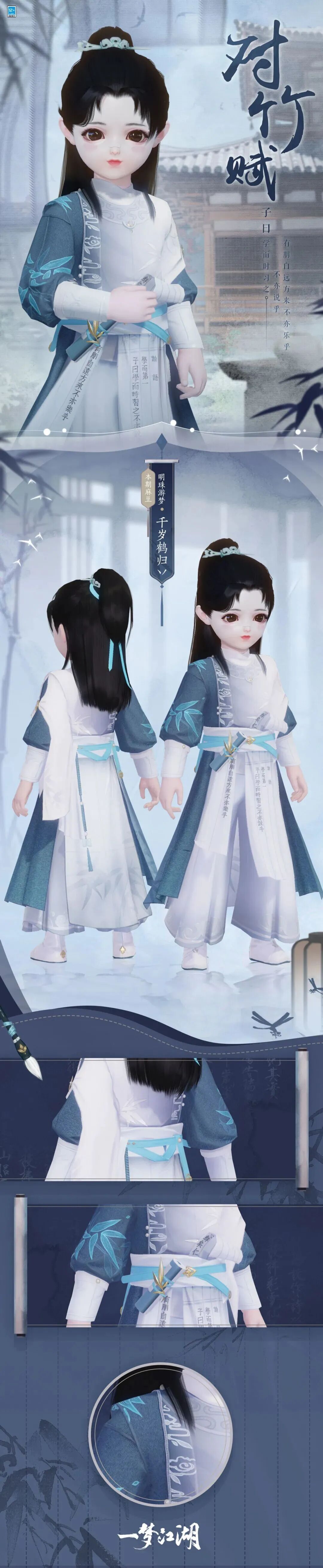 学而时习之,不亦说乎?整套时装·对竹赋以蓝白配色为主,衣间点缀着的祥云与竹叶纹饰,更衬出文人的如青竹般谦卑坚韧的气节与风骨!苍蓝色修身内衬,白色外衫,温文尔雅,风度翩翩令人眼前一亮!
