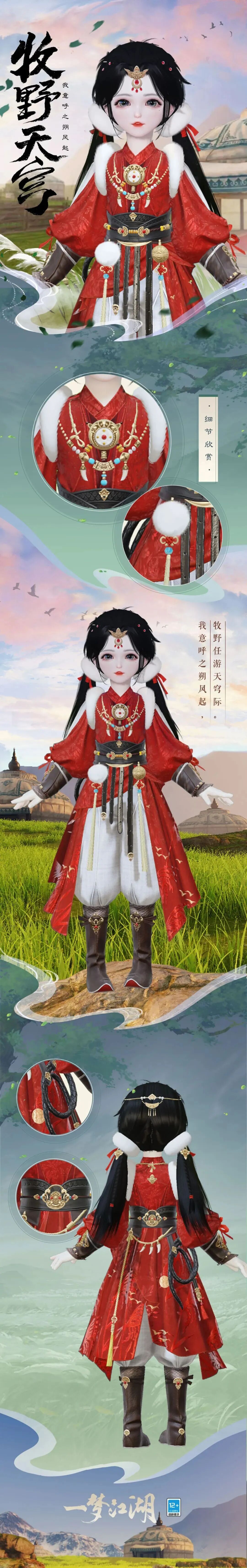女款时装以洁白皮毛搭配赤色裙袍,红白之间精致金饰熠熠生辉,皮革护腕与腰封的加入,更为明艳大气的她们增添了几分飒爽~