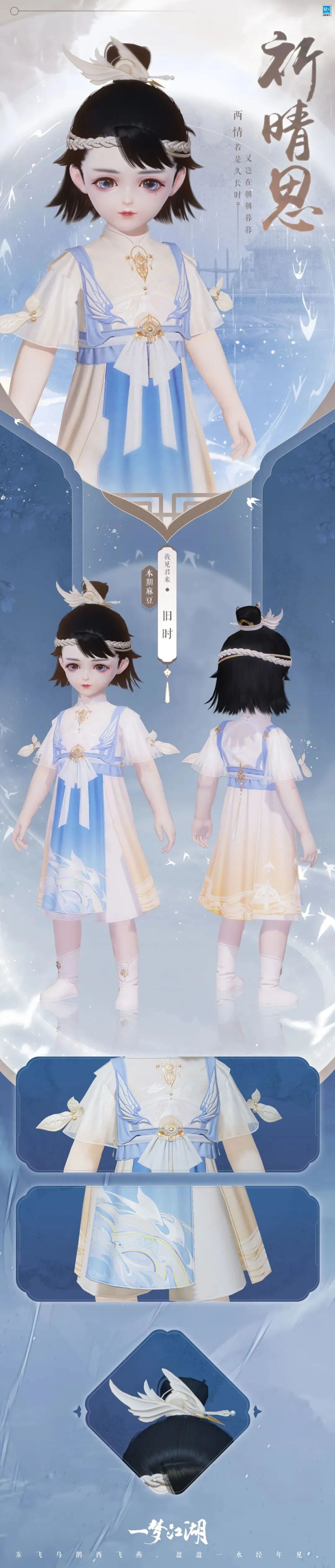迢迢郎意,盈盈妾恨,今夕鹊桥欲度。整套时装·祈晴思以蓝黄配色为主,将帮助牛郎织女相会的鹊桥融入了衣袖之间。