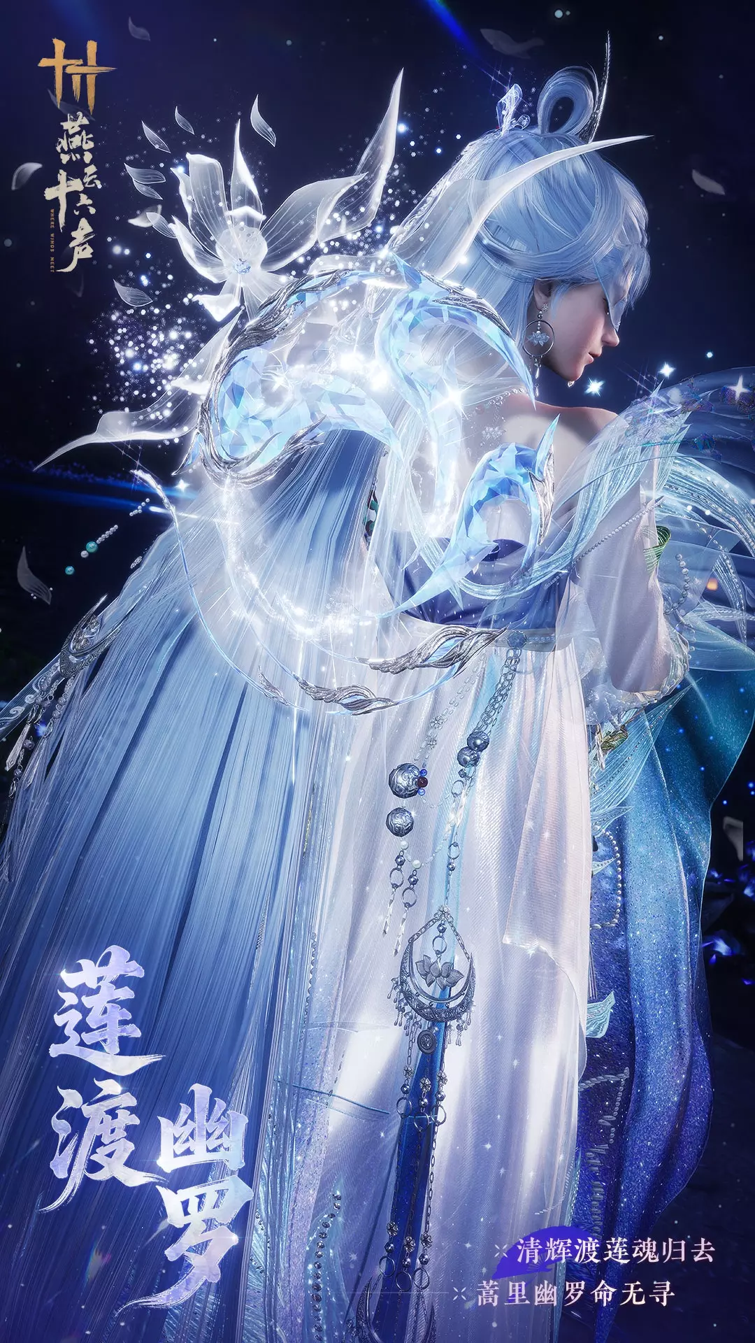 此衣取意自忘川河畔的接引之莲,一刚一柔,一渡一引。男款以幽蓝为底,金纹错绣,紫晶缀襟。雪裘覆肩,紫焰幽莲绽放,自成威服一界之仪。女款衣如月华倾泻,若清夜之莲,独放幽潭。素纱障目,不视红尘,月轮悬发,流光萦身,恍兮惚兮,如彼渡魂之仙,照归途于冥冥。