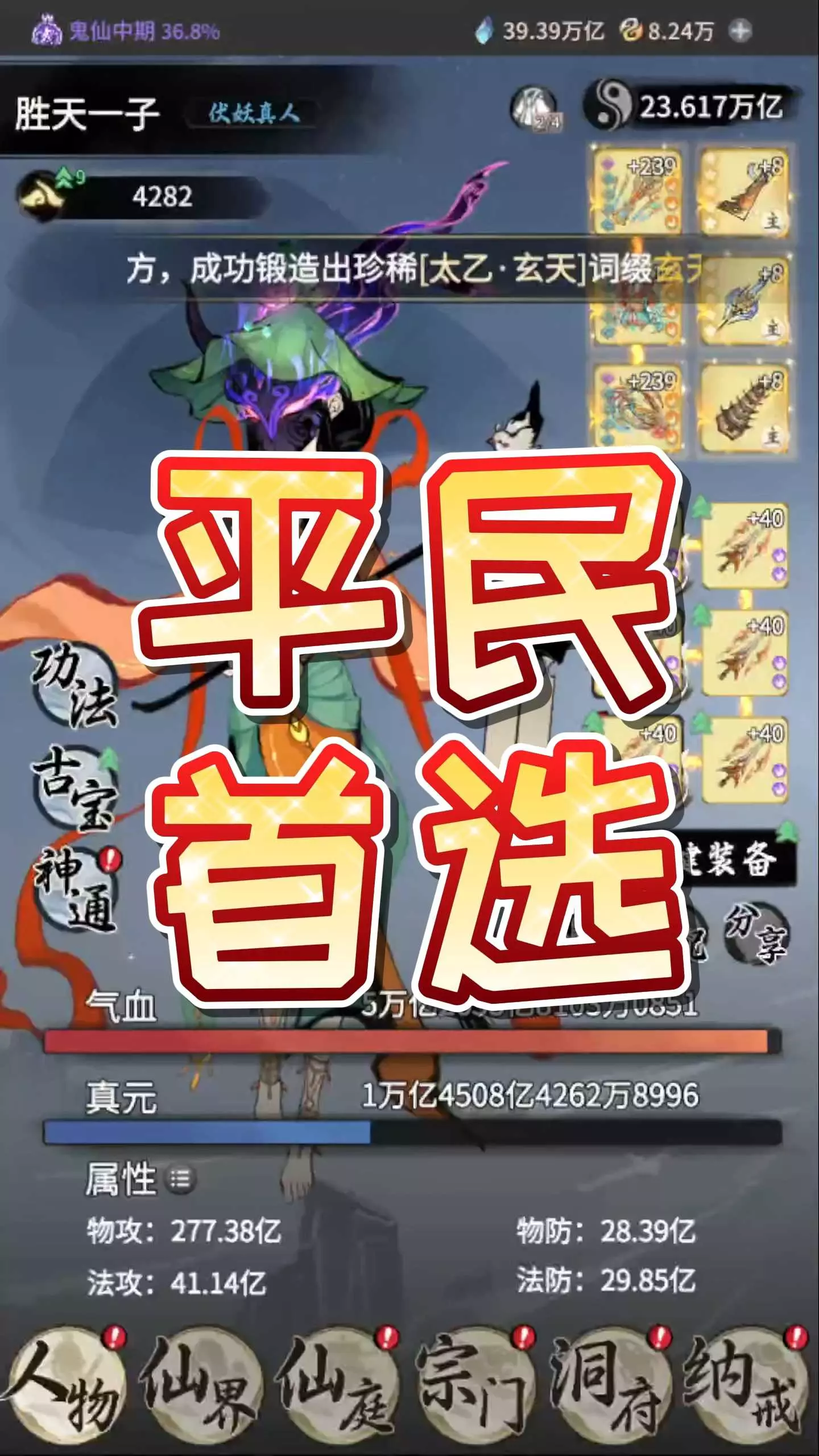 这是《一念逍遥》的游戏账号展示,花费1300夺舍了原本氪14万的万古号,账号处于大罗前期,属性、古宝等养成度高,当前以养老玩法游玩。
