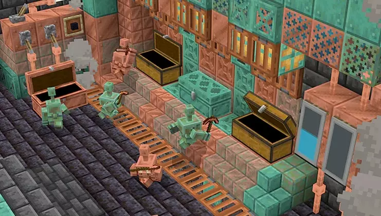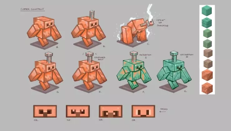 哦,还有一件事。像铜块一样,铜魔像会随着时间逐渐氧化——变得越来越绿。完全氧化后,它们将无法移动,变成雕像。你需要用斧头逐阶段刮除氧化层。魔像也可以用蜂窝打蜡以防止氧化。