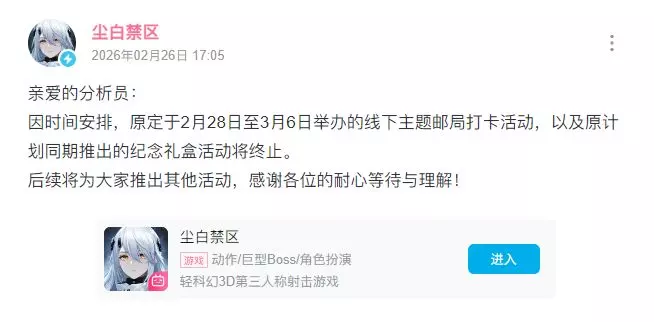 《尘白禁区》×「中国邮政」联动终止! 原定2月28日举办的线下打卡活动、纪念礼盒活动同步取消。 自官方宣布与「中国邮政」联动,便被部分网友质疑反对,认为其存在“擦边”等问题。