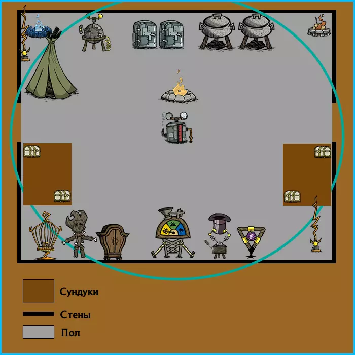 秋季是你艰难生存的第一个季节。由于第一年没有首领,加上气温的高低变化、频繁的降雨以及各种其他问题,秋季会给你足够的时间来准备和建造营地。在标准设置下,秋季持续20天;最低设置为5天,短设置为12天,长设置为30天,最高设置为50天。本赛季为了继续生存,你需要完成以下几件事,具体如下: 【侦查地形】不必走遍整张地图。只需了解你所需物品的位置,例如:猪王、沙漠、热带草原、格洛默雕像、岩石生物群落等等。 【建造住所】请注意,建造营地需要非常合理的规划。我建议你特别注意吹雪机,它会在接近夏季时解锁,因为所有易燃建筑都必须位于它的作用范围内。如果忽视它,后续会出现问题,你要么得想办法找个还算合适的位置安装,要么就得造第二个,这在我看来相当耗费资源。制作冬季服装 为了在寒冷季节舒适生存,你的角色需要保暖衣物,例如厚毛衣或冬季帽子。此外,保温石和胡须(如果你有的话)也有助于保持体温。 关于哪些物品更保暖,哪些不保暖的详细信息,你可以在相关资料的“隔热”部分中查看。储备食物 正如游戏名称所提示的——不要挨饿。最好在冬天开始前提前储备食物,因为低温环境下,浆果丛、胡萝卜、菜园以及其他可食用植物都会停止生长。动物的情况相对好一些,但要想吃到它们的肉,你得先找到并杀死它们,这在体温持续流失的情况下,可不像秋天那么容易。建议获取科洛斯隆的机械臂,并为自己和朋友制作保暖外套,否则外出探索会比没有这些装备时困难得多。有个好消息是,冬天食物变质的速度会慢很多,如果把食物放进冰箱,由于冬天的低温效果和冰箱的制冷效果会叠加,食物的保存时间会比平时长得多。储备资源 除了衣物、营地、食物和侦察工作外,你还需要储备一些资源,这样冬天就不用到处奔波去寻找了。这些资源可能包括篝火用的燃料、手电筒的电池、草、树枝、芦苇——总之,你懂我的意思。 营地 现在来说说需要建造的东西,这样以后就不用拆毁或者搬到别的地方去了。正如我之前所述,【吹雪机】的摆放位置十分重要。它的功能是扑灭夏季频繁发生的火灾。尽管它在灭火任务上表现出色,但有一个明显的缺点——它会浇灭火堆。无论是普通火堆还是【吸热火堆】,吹雪机都会将其扑灭。有两种方法可以避免这种情况:第一种是将篝火放置在她的范围之外。第二种是安装允许它们共存的模组(有关这一点将在指南末尾详细说明)。这是我在《饥荒:联机版》中通常建造营地的示例。请注意——所有易燃建筑都位于她的作用范围(蓝圈)内。