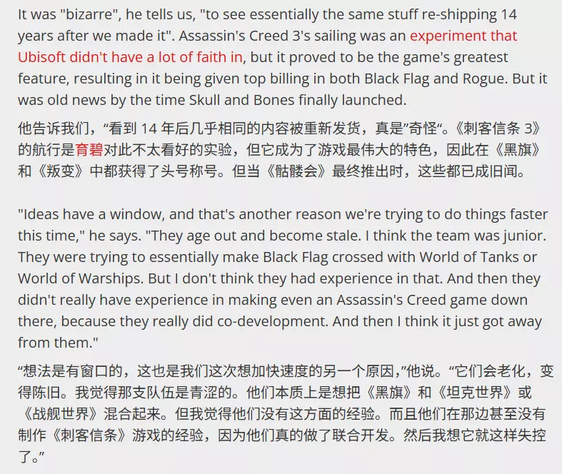 他指出,《碧海黑帆》之所以开发如此之久,很可能是因为其开发工作室育碧新加坡当时缺乏驾驭这种规模玩法所需的经验。该工作室成立于2008年,长期以来主要作为支援团队参与《刺客信条2》等作品的协同开发,并未主导过完整的项目。