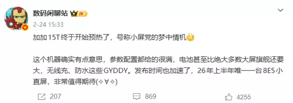 值得一提的是,李杰还在微博发起投票,询问“小屏手机还有哪些体验痛点没被解决?” 他给出的选项包括: 同样的旗舰芯片性能打折、帧率不稳发热、电池容量小、没有潜望长焦、没有无线充电、防水等级不够高。 从投票选项来看,一加15T很可能针对上述痛点逐一补强。 据了解,数码博主“数码闲聊站”曾称该机确实有点意思,参数配置给得很满,电池甚至比绝大多数大屏旗舰还要大。