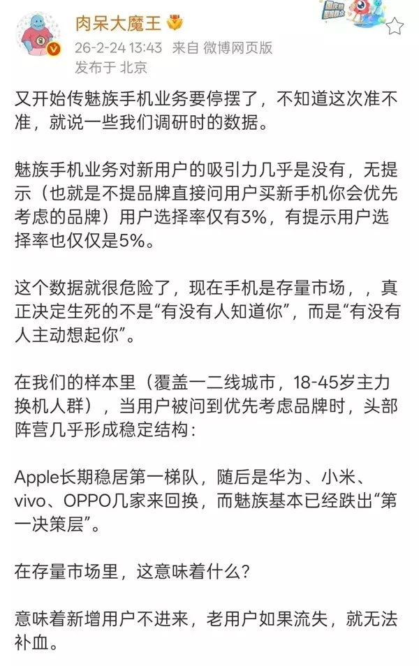 吉利给魅族输了血,是希望魅族能交出满意的答卷,可是被收购前的魅族就已经没有交出满分答卷的能力了。 其中一个很重要的原因是我们上面说过的,魅族的人才流失。 那几年刚好赶上国产厂商们狂卷系统优化,某些厂商光是影像团队就有上千人,但是反观魅族内部早就被挖空了,哪还有人力去搞研发? 此外,多方的利益权衡也让魅族不能放开手再做以往那些 “ 极致 ” 的手机,这些也让魅族几乎丧失了自己最后一块护城河 —— 老魅友。 微博博主 @肉呆大魔王 昨天公布了他们的一份调研数据,魅族手机不光对新用户的吸引力几乎没有,老用户里也有 57% 的人表示下一部手机不会选择魅族。