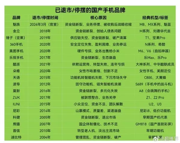 快科技2月26日消息,据国内媒体报道称,魅族手机可能将成为历史。 多位知情人士表示,魅族手机业务已经实质性停摆,将于2026年3月正式退市。 有接近魅族的人士透露,从去年4月开始,魅族已经有很多供应商的款项无法正常结算,至今仍有大量欠款已成为坏账,“魅族的结局大概率是申请破产。” 据悉,魅族旗下FlymeAuto车机业务将独立运营,魅族品牌或将继续保留在吉利体系内。 据悉,星纪魅族的飞书大群目前还剩1000多人,但有不少员工已提出离职,少量员工已转岗至吉利体系内的极氪汽车。 消息一出,立刻引起了网友的热议,不少人甚至怀念起那个曾经的魅族,毕竟太过辉煌。 有网友甚至感慨:“一代人的记忆将成为历史,可惜了!市场竞争就是这么的残酷!” 殊不知,在这之前已经有18个国产手机品牌已经倒下了,有大家熟知的360手机、美图手机、金立等等。 现在问题来了,你用过哪些已经倒闭的国产手机品牌呢?