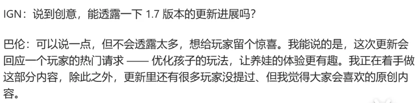 我们正在筹备的新更新会让游戏体验更上一层楼,也能让暂离的玩家找到回归的理由。