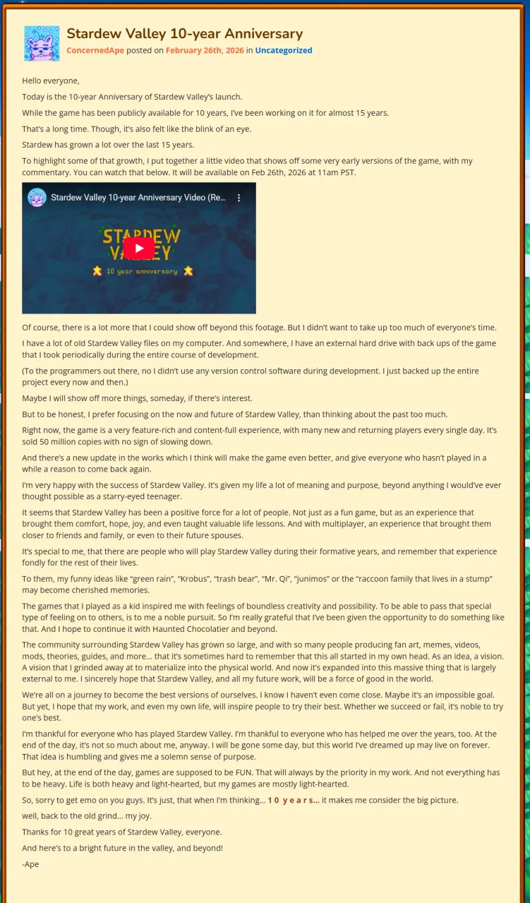 与此同时,作者在其星露谷博客上发布了十周年的感想: