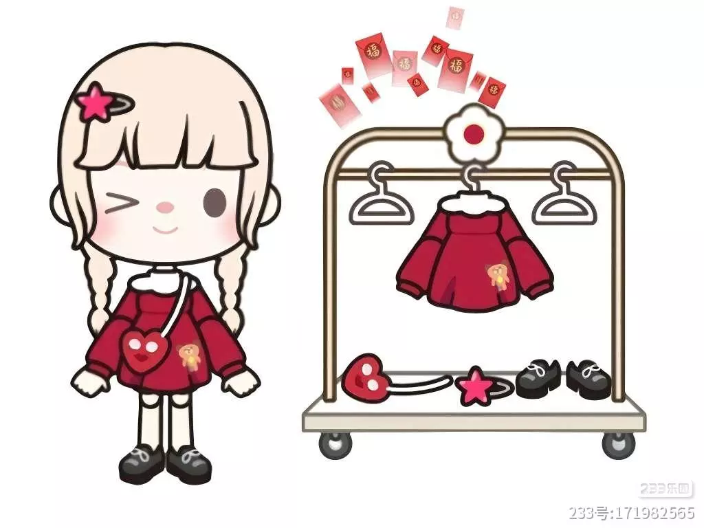 粉色星星造型发卡+红色白领棉裙+红色心形斜挎包+黑色小皮鞋