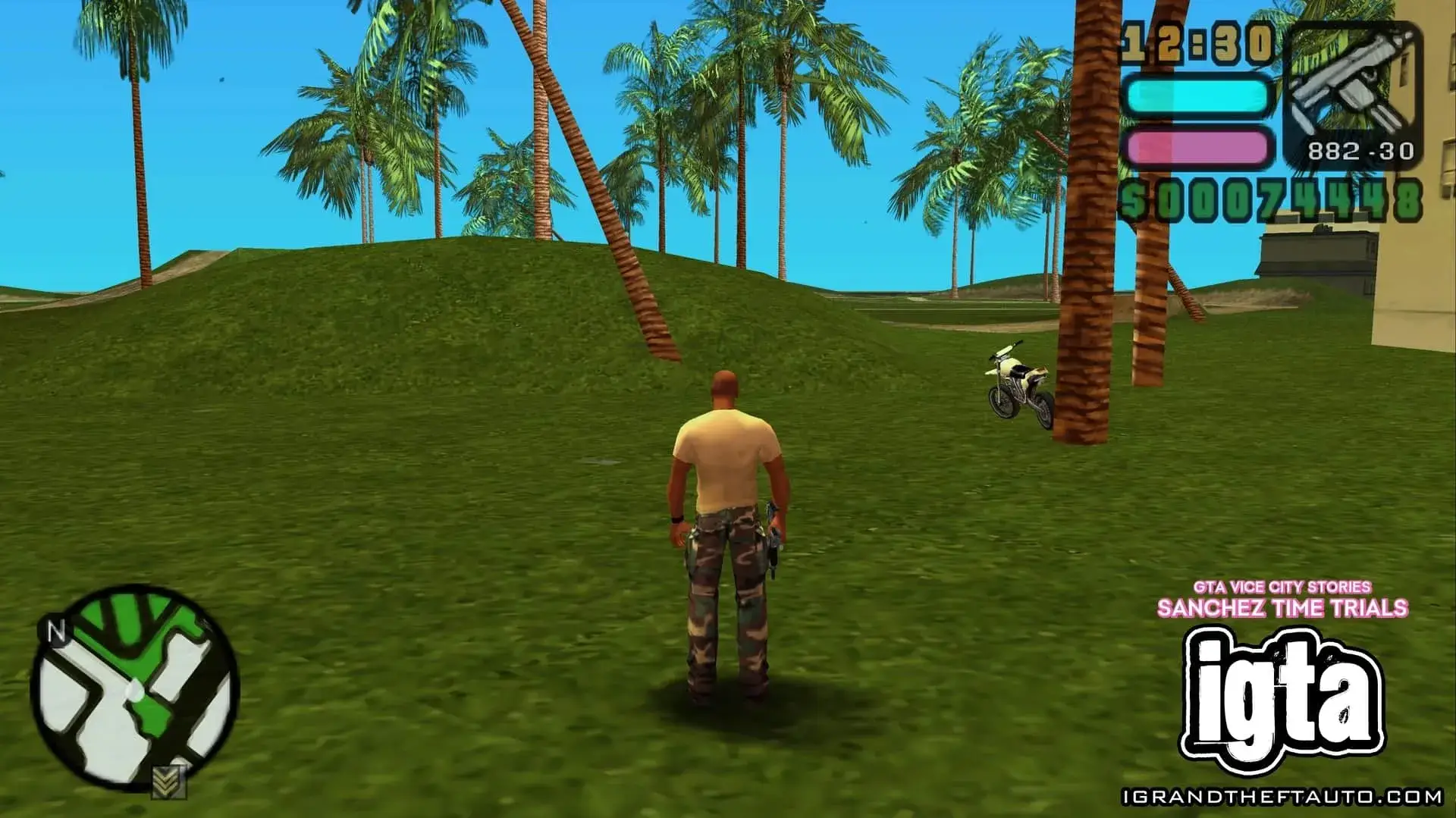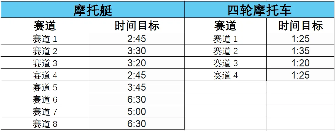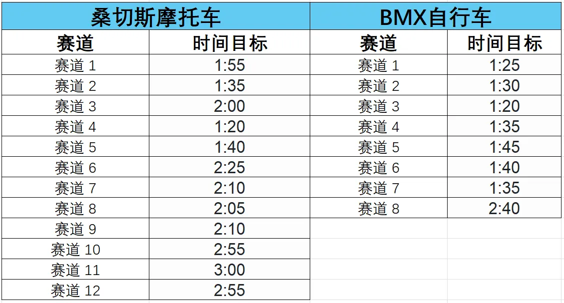 这是《GTA:罪恶都市传奇》的4类时间测试比赛攻略,包含桑切斯摩托车、BMX自行车、四轮摩托、摩托艇的比赛点位地图,以及各赛道的完成时间目标,玩家需在指定时间内完成对应赛道。
