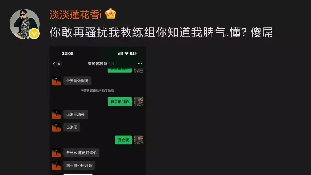 JDG经理连莲花,赛后晒出了AL经理爱笑,和自家分析师的聊天记录,并且配文:敢再骚扰我教练组,你知道我脾气,傻D,聊天记录里的内容很有意思,爱笑问京东分析师:今天能做到吗?分析师回应正在开会,爱笑表示:开什么,随便打你们,国一教(指的是Tabe教练)不用开会。