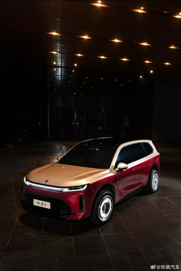 快科技2月27日消息, 今日,上汽通用五菱与华为深化战略合作的首款旗舰车型华境S炽焰鎏金色官图发布,新车定位为大六座SUV。 外观方面, 华境S炽焰鎏金色版本在外观设计上核心采用迈巴赫同款双拼车身设计,车身顶部为金色,下部为红色,搭配同款“大饼轮圈”,成为该车型外观的标志性设计。 新车前脸配备星环式贯穿灯组,下方两侧为L型导流槽,搭配了多边形进气口。