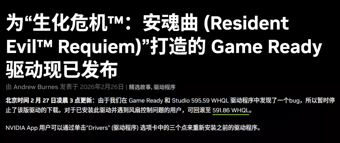 英伟达今日宣布,于2月26日推送更新的 Studio 595.59 WHQL GeForce Game Ready驱动出现bug问题,会导致用户的风扇控制出现问题,目前已经停止推送,遇到问题的玩家们可回滚至591.86 WHQL版本。