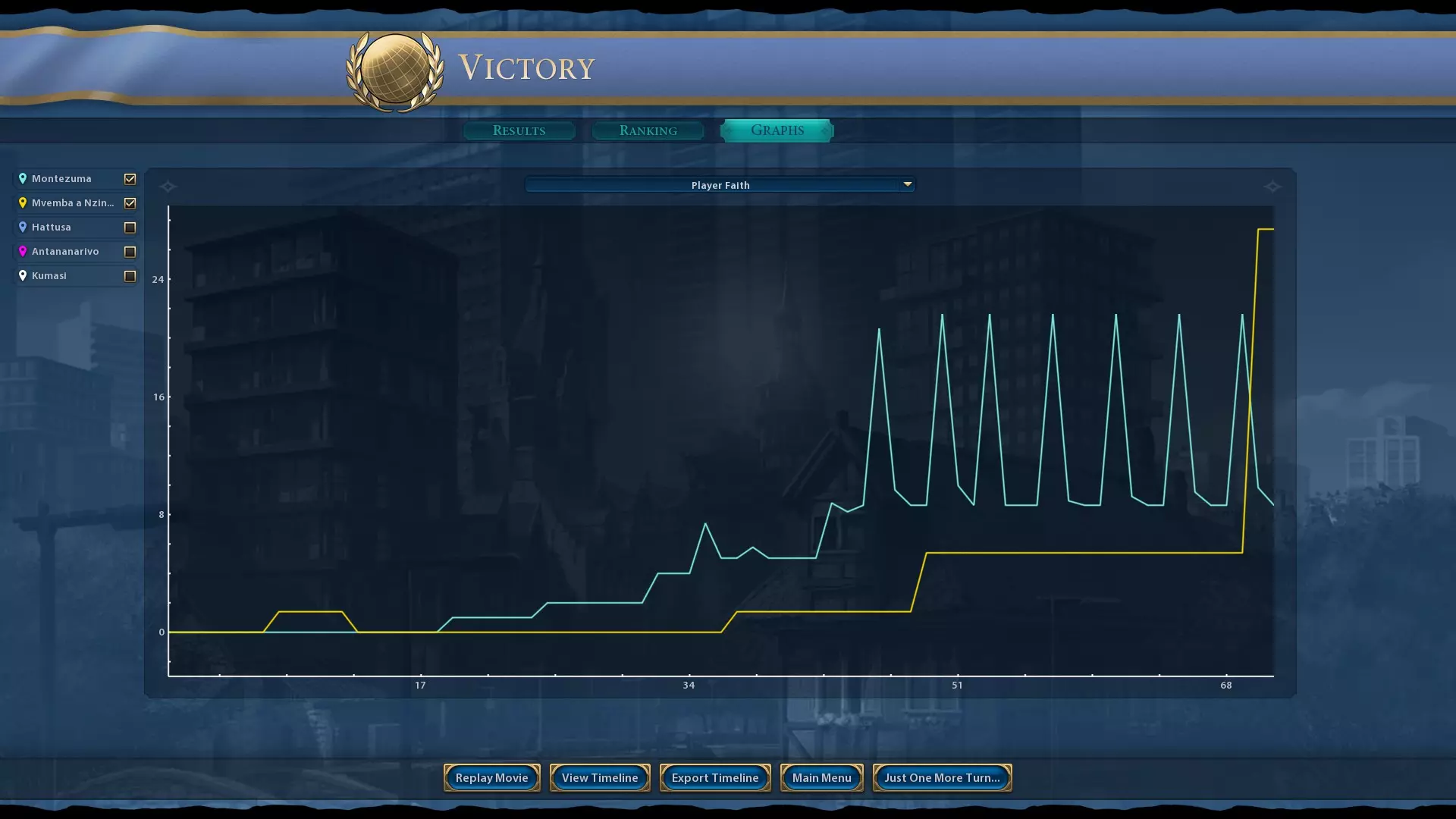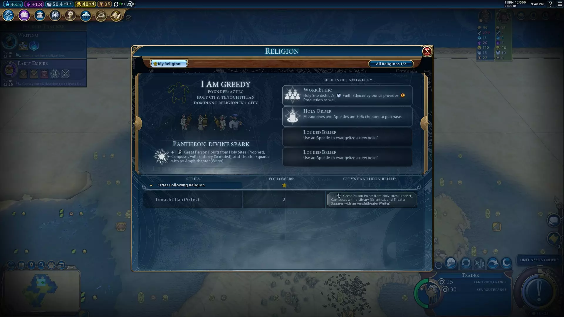 之后,最终派侦察兵去寻找姆本巴。确保向他派遣代表团。至于你的城市,在游戏剩余时间里进行圣地祈祷,只有当你能建造寺庙时才停止。当条件允许时,购买一名商人,对刚果施加额外的宗教压力。 关于信仰,如果你成功找到圣物,选择【圣物箱】和【圣教骑士团】。否则,选择【工作伦理】。 第42回合:先知与宗教