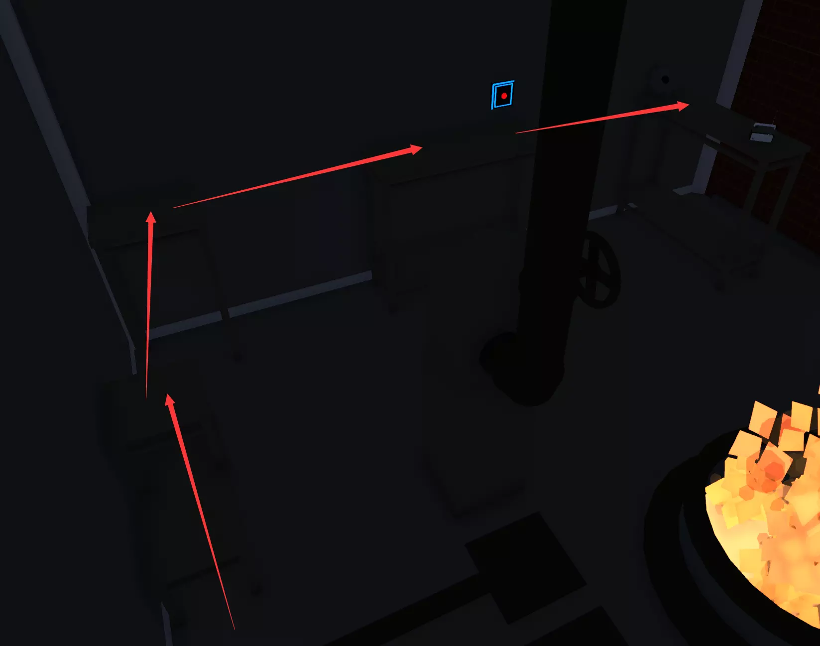 “黑暗”关卡中,在给电闸拉闸断电后,拿起盖住通关口的那块躺着人的板子,板子会飞起来,你会跟着一起飞起来。木板?不了,谢谢。