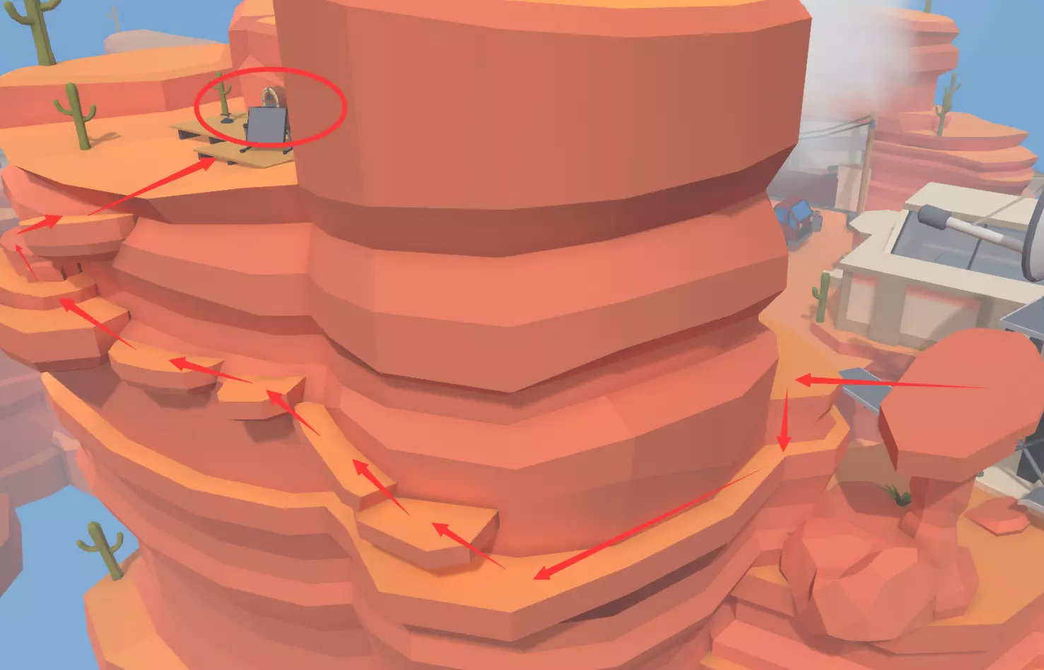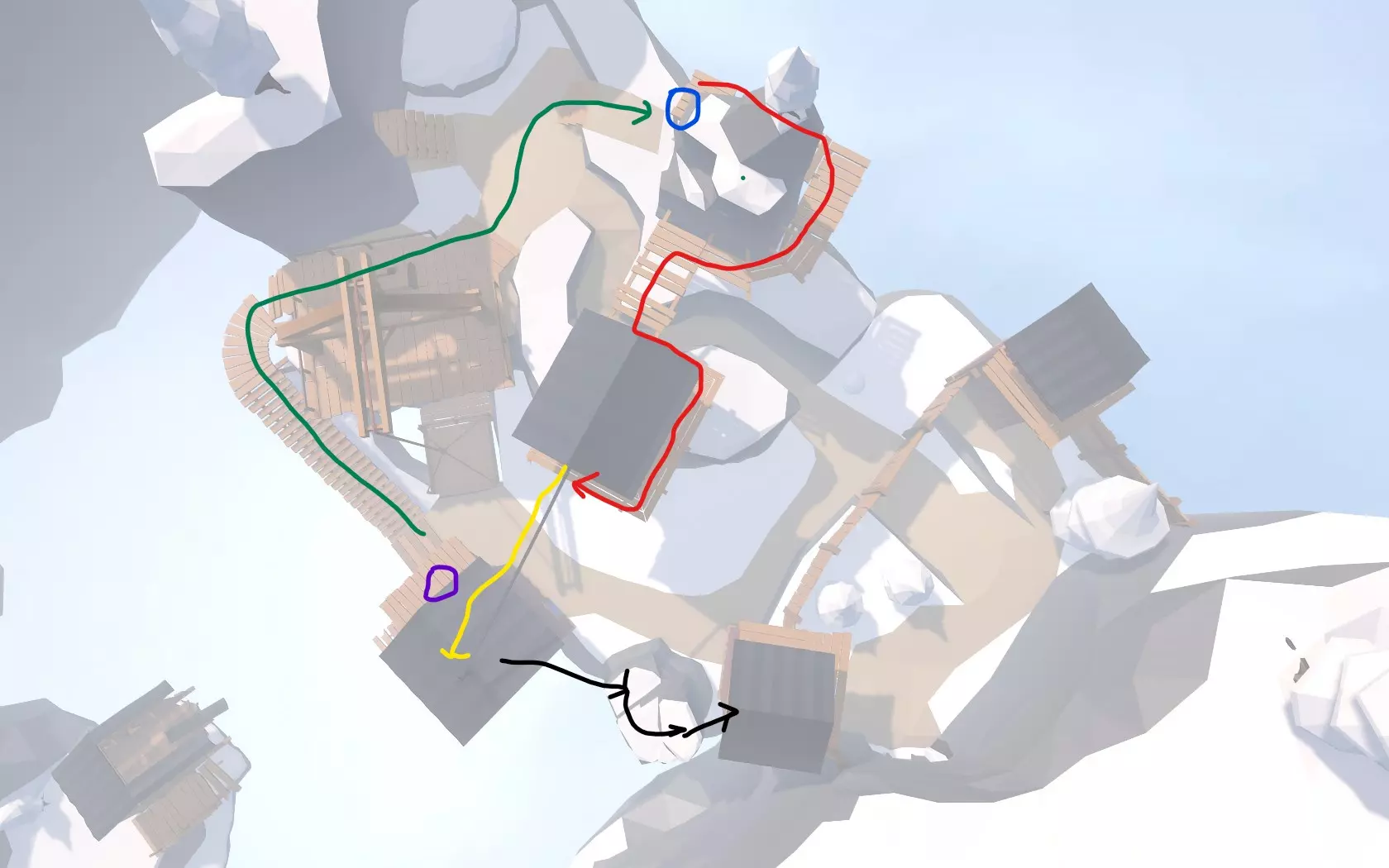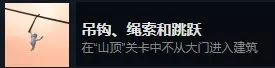 “山顶”关卡中不通过大门进入建筑(即通过小蓝门进入高房子)的方法有很多种,且需在进入后再从蓝门出来才能获得成就。详细步骤如下:先上到紫圈位置建筑的屋顶房间,拿取【拐杖】,接着沿绿线行走至蓝圈,用【拐杖】勾上面的【黑色东西】往后拉,楼梯就会落下,然后沿红线到达滑索处,沿黄线通过滑索滑到紫圈建筑屋顶,往左方向跳到那座【小山】上(沿黑线),最后通过窗户跳进建筑。