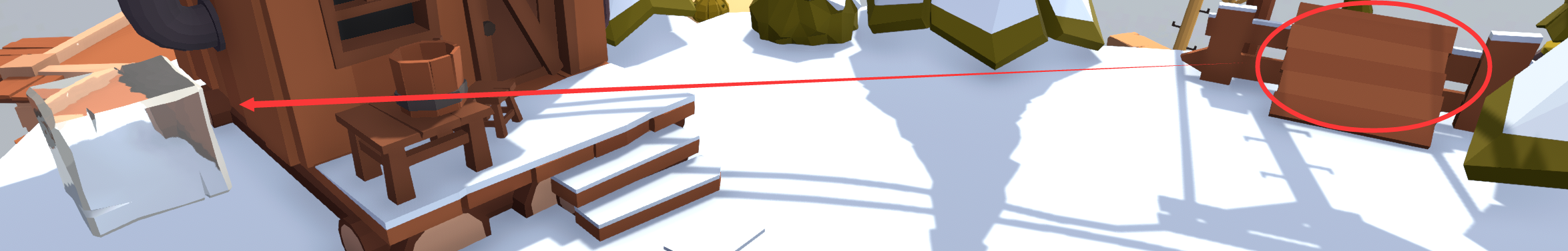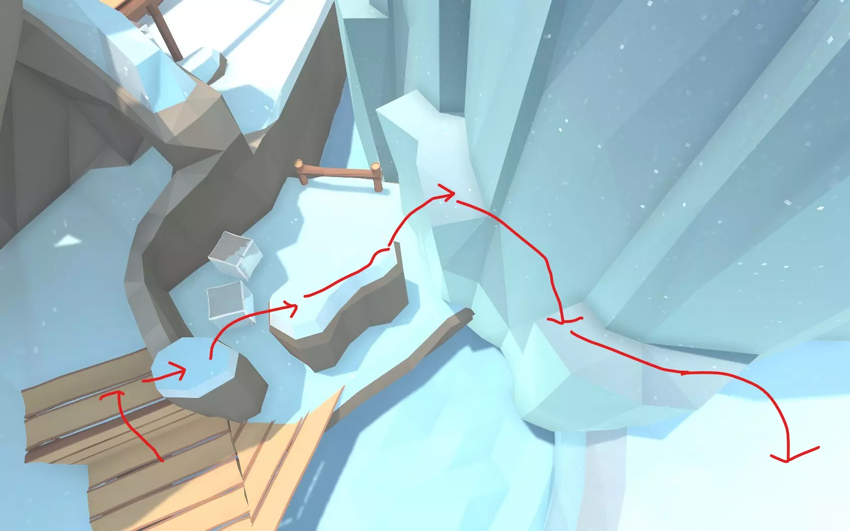 “冰”关卡不用摇摇板完成摇摇板挑战的方法:会爬墙的玩家可利用房子爬上去;不会爬墙的玩家可从摇摇板上方的那座山跳过去,在关卡开始的地方就能爬上山。或者,按以下步骤操作:将紫圈位置的冰搬到红圈位置,踩在冰上后沿着绿线行走并攀爬上山,最终到达蓝圈位置。