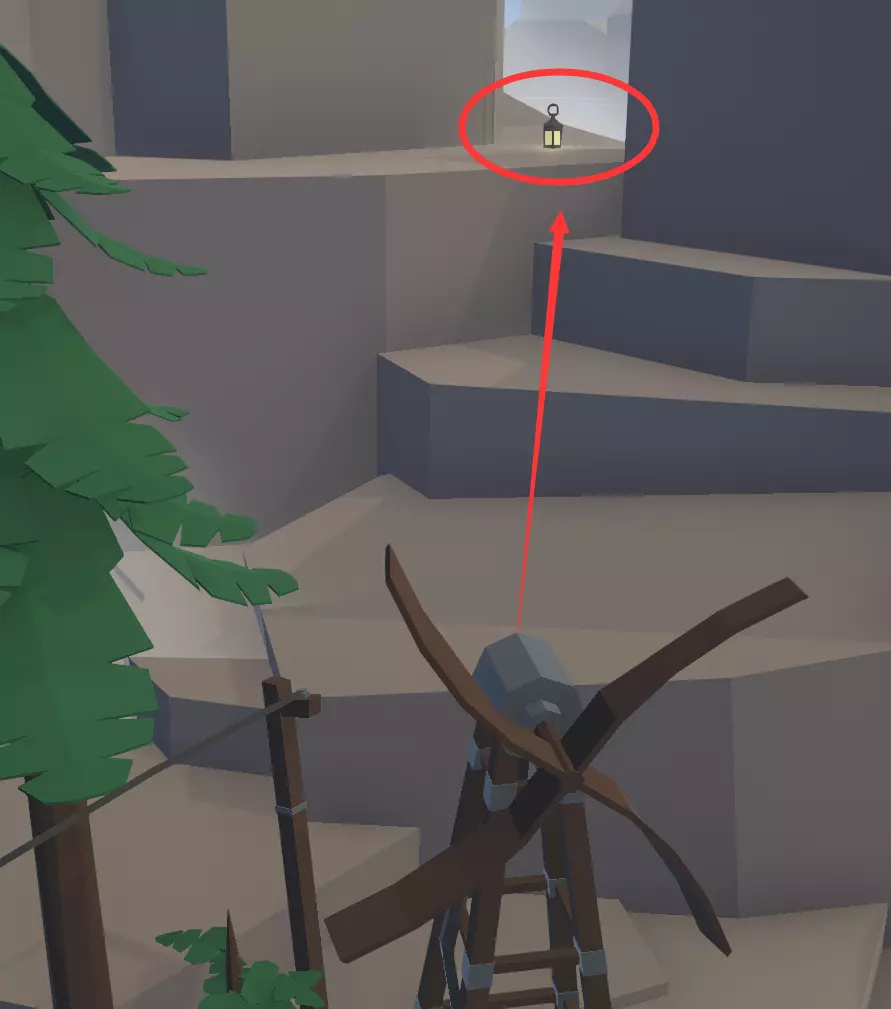 在风车处解开谜题后,风车会开始转动。抓住风车扇叶前往顶部,从顶部通过,不要走下方的山洞。