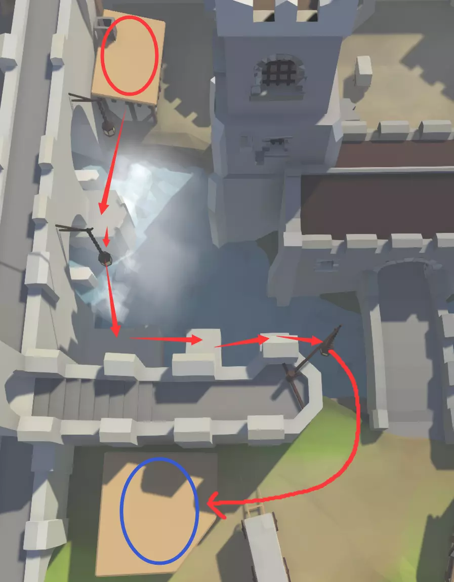 呼吸练习“水”关卡中,在水中听到18声泡泡声后迅速浮出水面(用心去感受) 头朝下“水”关卡中,站在通关点旁按【Y】键装死(可能你改过键位),就有可能头朝下掉入水中,然后通关 凌波微步“城堡”关卡中,在进入城堡的第二个存档点跑到第三个存档点(按套路走),抓住最后的“吊灯”,它会把你带到一个铁匠铺房顶上,注意不要落在土地上,也不要重生,红圈为起点,蓝圈为终点