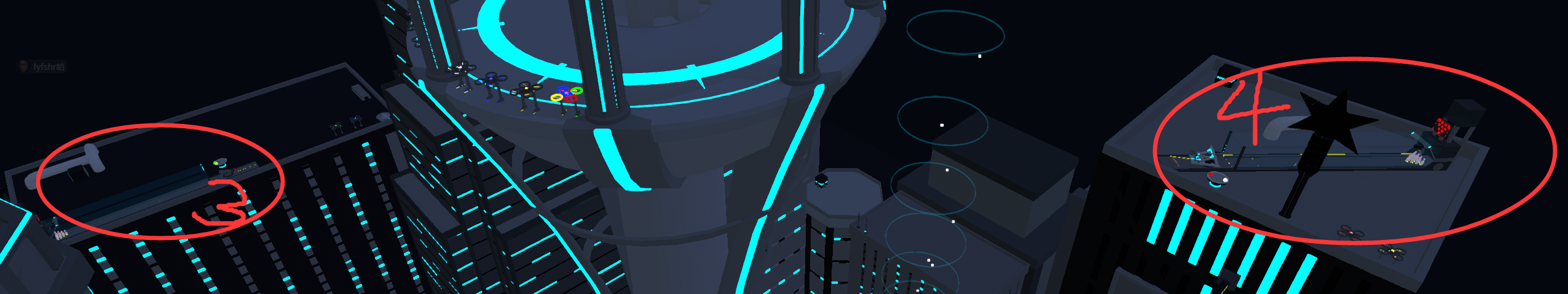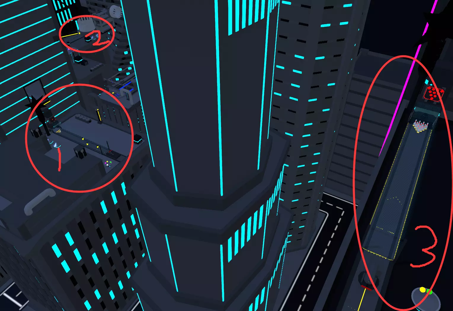 完成四条保龄球道(谜题),后期需要用无人机飞上去。第一条就在出生点旁边。