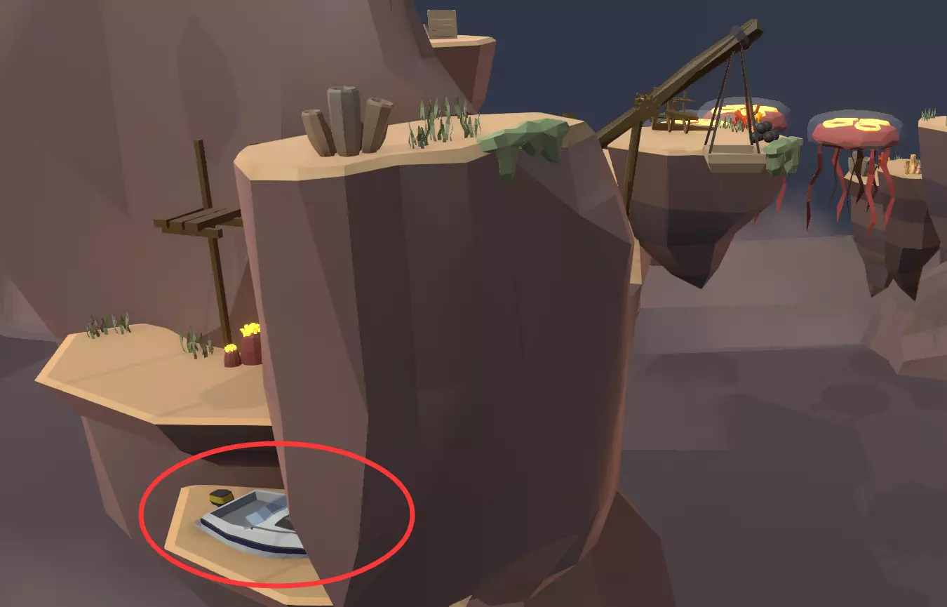 快艇就在这里,沿着石头爬下去碰到快艇即可。简易勘探装置