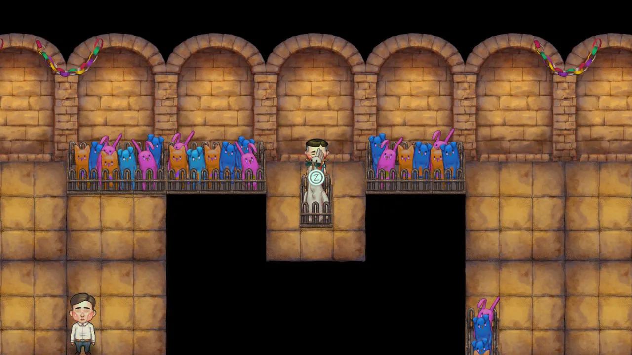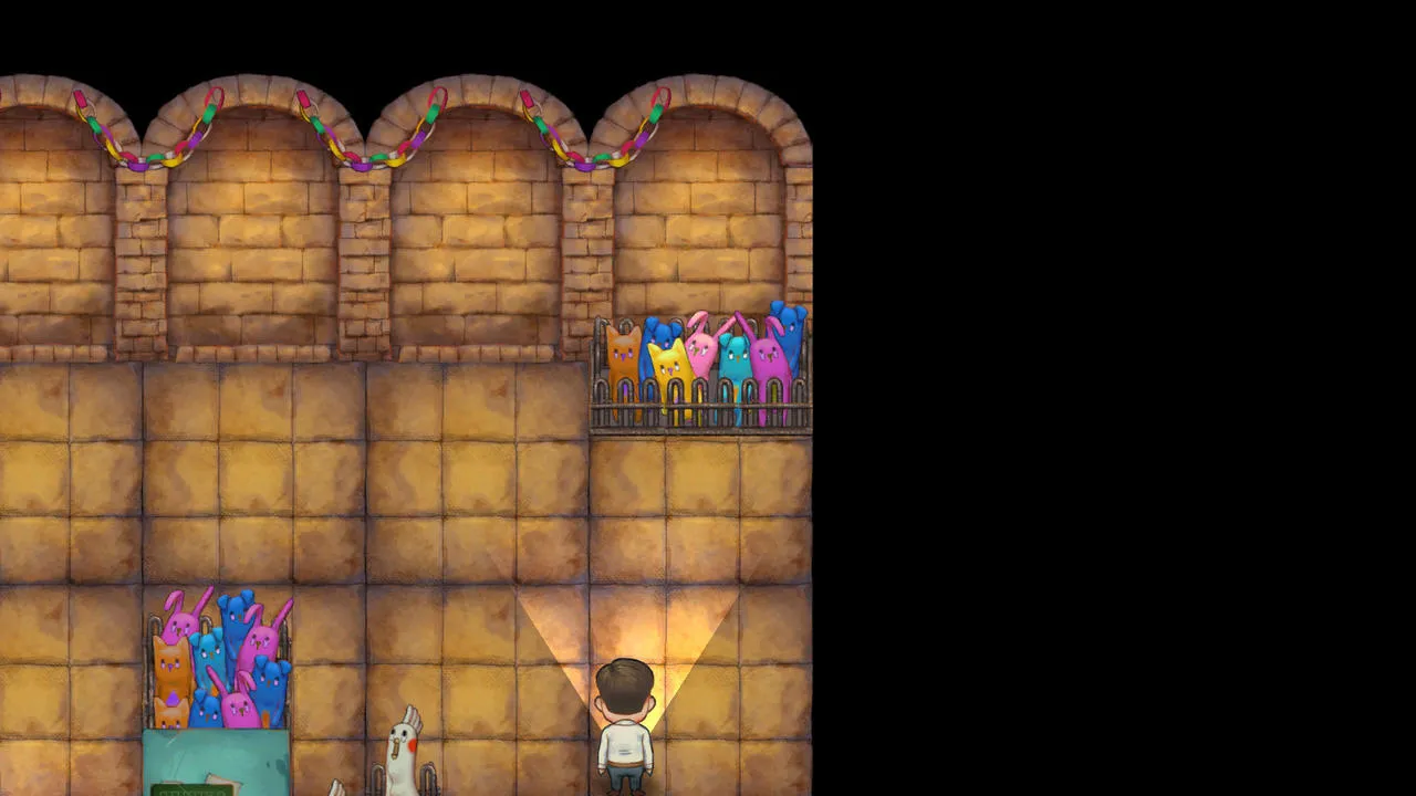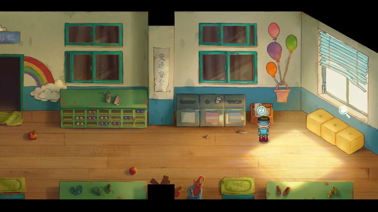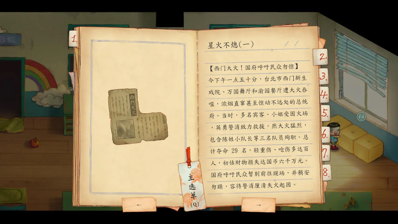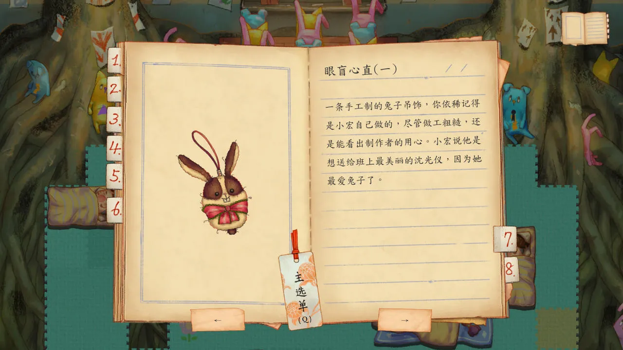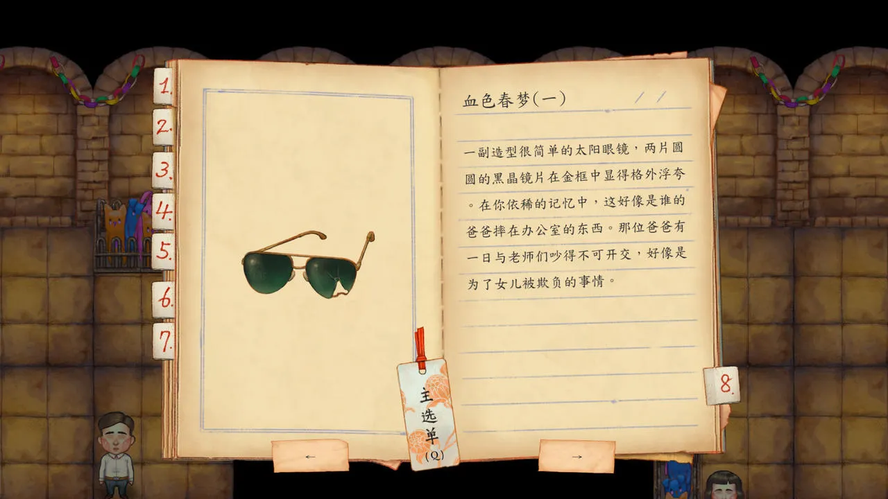 第一章,《静悄悄》,从一个固定位置的男老师上方的玩偶往右走,进入隐藏空间调查墨镜