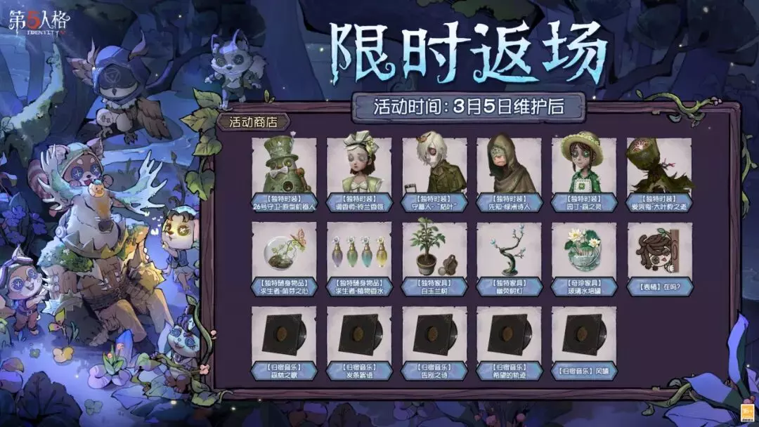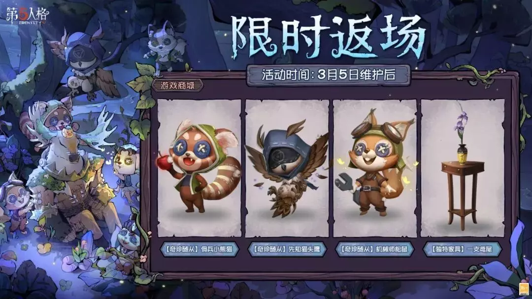 图中所示的往年植树节主题活动道具将限时返场活动商店,【奇珍随从】佣兵小熊猫、先知猫头鹰、机械师松鼠也将限时返场游戏商城!